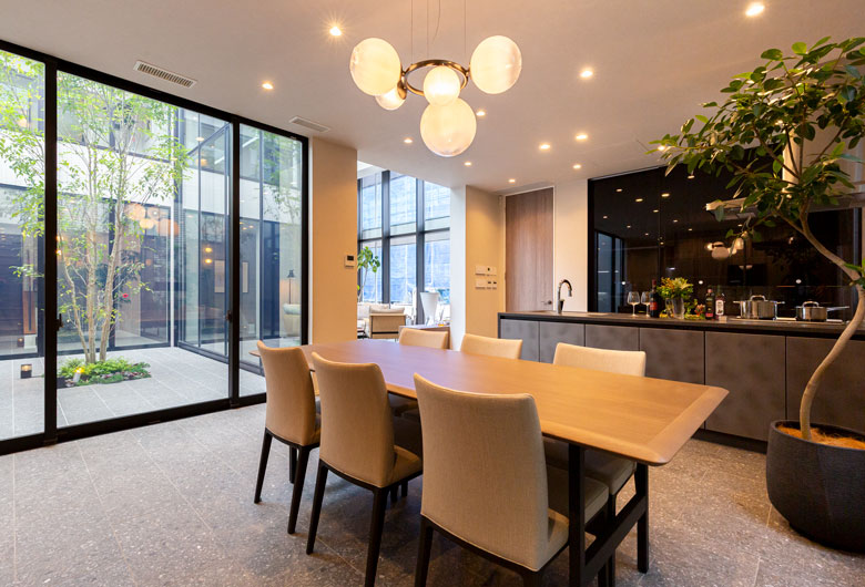 中庭を中心としたコートハウスの形式をとることで内に向かって開き、プライバシーを守りつつ開放感を得られるようにした空間設計です。吹抜空間の開放感を損なわないよう、2階をつなぐ吊廊下の床面をスチールでつくり、極限まで薄く軽やかなデザインとしました。