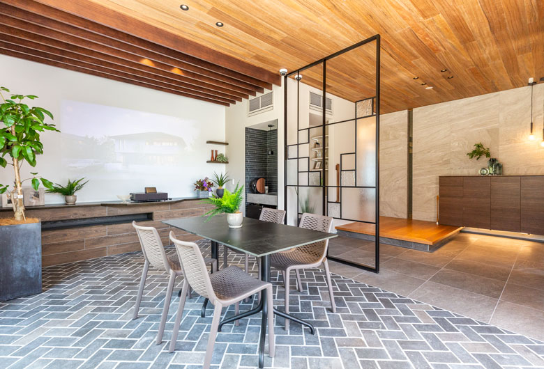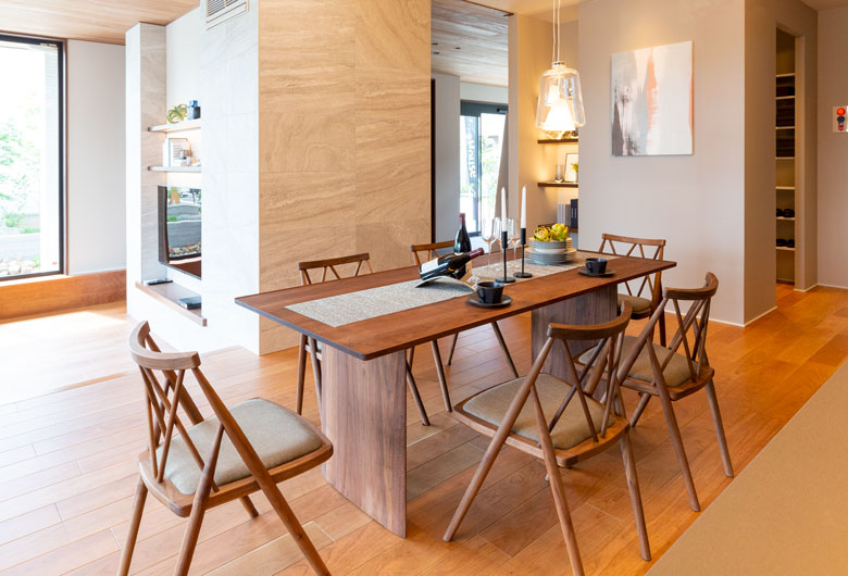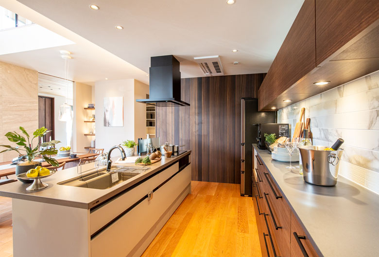 ロースタイルリビングは、オープンなLDKの開放感を損なわず別の空間のような落ち着きのある雰囲気に。床を下げることにより、リビングの天井がよりいっそう高く感じられます。2WAYスタイルの玄関ホールは家族の片付けロッカー付きでいつでもスッキリ。「家事シェアハウス」の家事シェア動線があれば家族みんなが自然に家事を分担することができます。回遊できるアイランドキッチンは効率のよい動線で家族の見守りができます。ビルトインガレージを想定した多目的に使える土間スペースは趣味を最大限に活かせる空間をご提案します。
