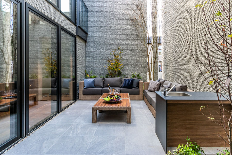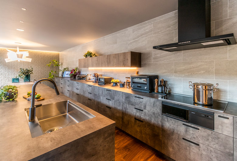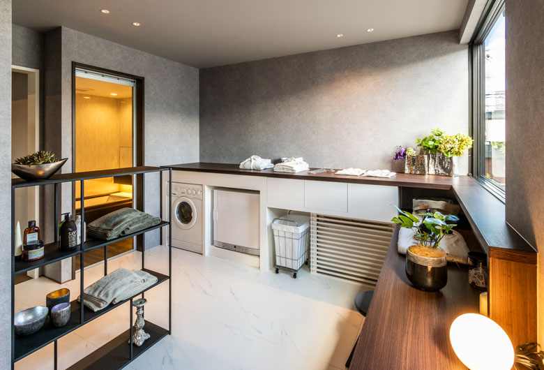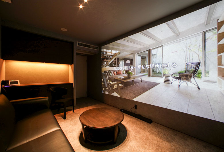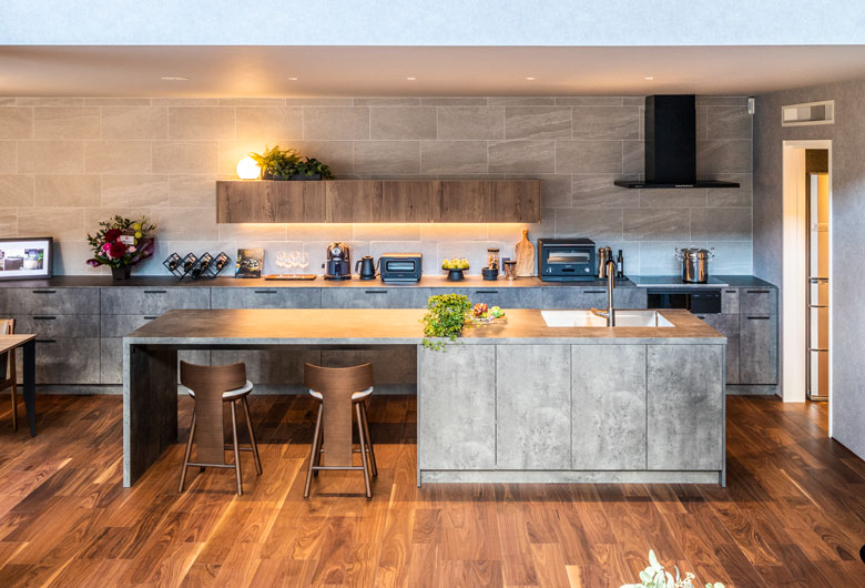 外部からの視線を遮る壁の内側は、プライバシーを確保した安心感と開放感のある空間デザインとなっています。ダインコンクリートの圧倒的な存在感と、深い軒下空間の陰影により、重厚感漂うワンランク上の邸宅をぜひこの展示場でご体感ください。