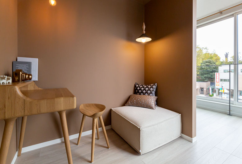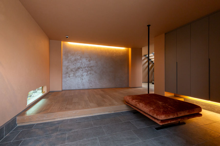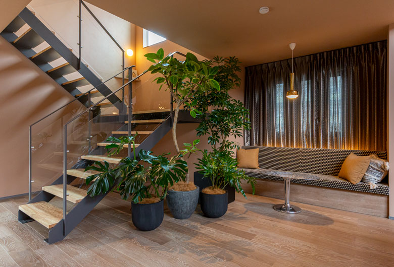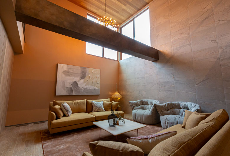 吹き抜けの解放感とテラコッタ調のインテリアが優しく包み込む、思わず立ち止まって眺めたくなる静謐な空間。セキスイハイムが得意なテクノロジーと心地よさの調和を体感できる、まさに自信作の展示場です。