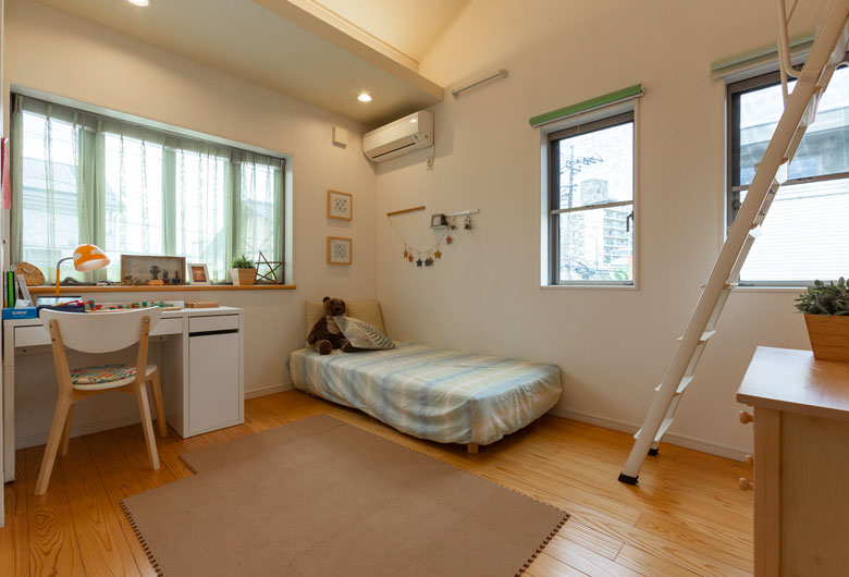 変形狭小地にも対応できる3階建て住宅。各居室は現実的な広さを体感できます。横の水平線を基調としたモダンな外観。吹き抜けから注ぐ光と、木質感溢れる暖かいイメージが特徴。古河林業ならではの『素材の風合い』を活かした、家族に優しい癒しの住まいをご提案します。