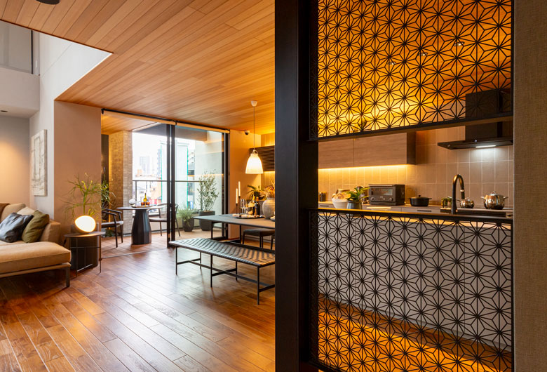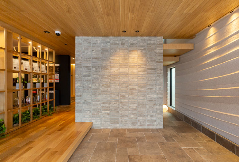 スクエアな3階建てのフォルムに庇の水平ラインと立てに伸びるアクセントタイルで演出した外観が印象的です。2階の開放的なリビング上部の吹抜に木質感のある各階の天井がモダンに映える空間演出をしました。多目的スペースを準備し映画鑑賞やヨガなど、ご家族が楽しめる空間をご提案しました。玄関ホールには陰影の出る特徴的な左官吹付がアクセントとなっています。