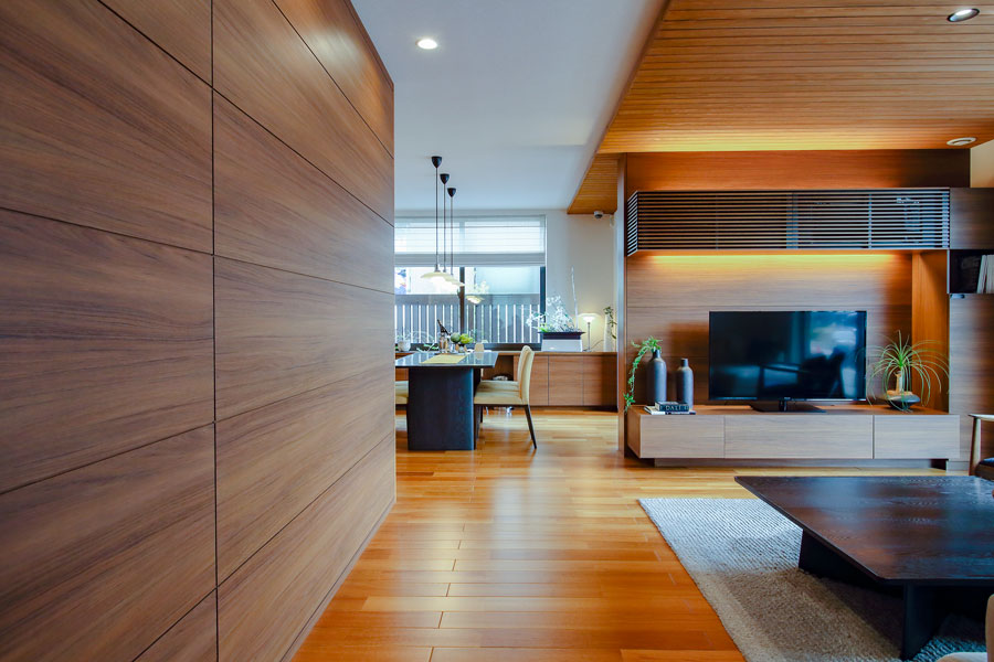 スクエアな3階建てのフォルムに庇の水平ラインと立てに伸びるアクセントタイルで演出した外観が印象的です。2階の開放的なリビング上部の吹抜に木質感のある各階の天井がモダンに映える空間演出をしました。多目的スペースを準備し映画鑑賞やヨガなど、ご家族が楽しめる空間をご提案しました。玄関ホールには陰影の出る特徴的な左官吹付がアクセントとなっています。