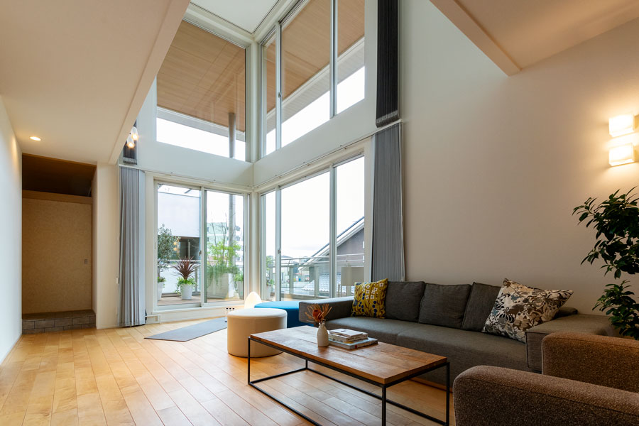 ・2層吹き抜け空間:開放感抜群です。空に近い心地よさを感じる、スローリビングを御覧ください。