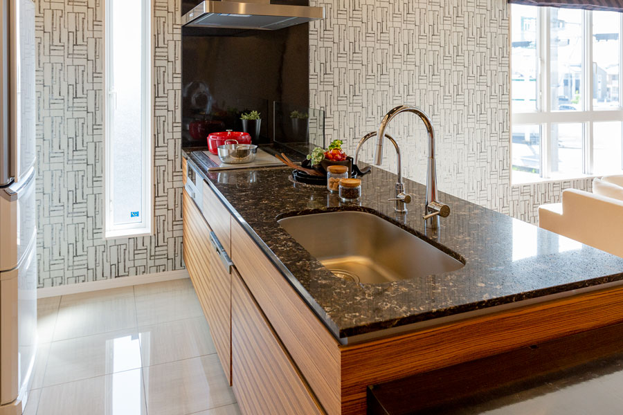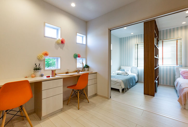 LDKでは大きな吹き抜けが広々と開放的な空間を創り出し、その中にウィンドウソファーやヌック等を配置して自然と家族が集まる空間になっています。