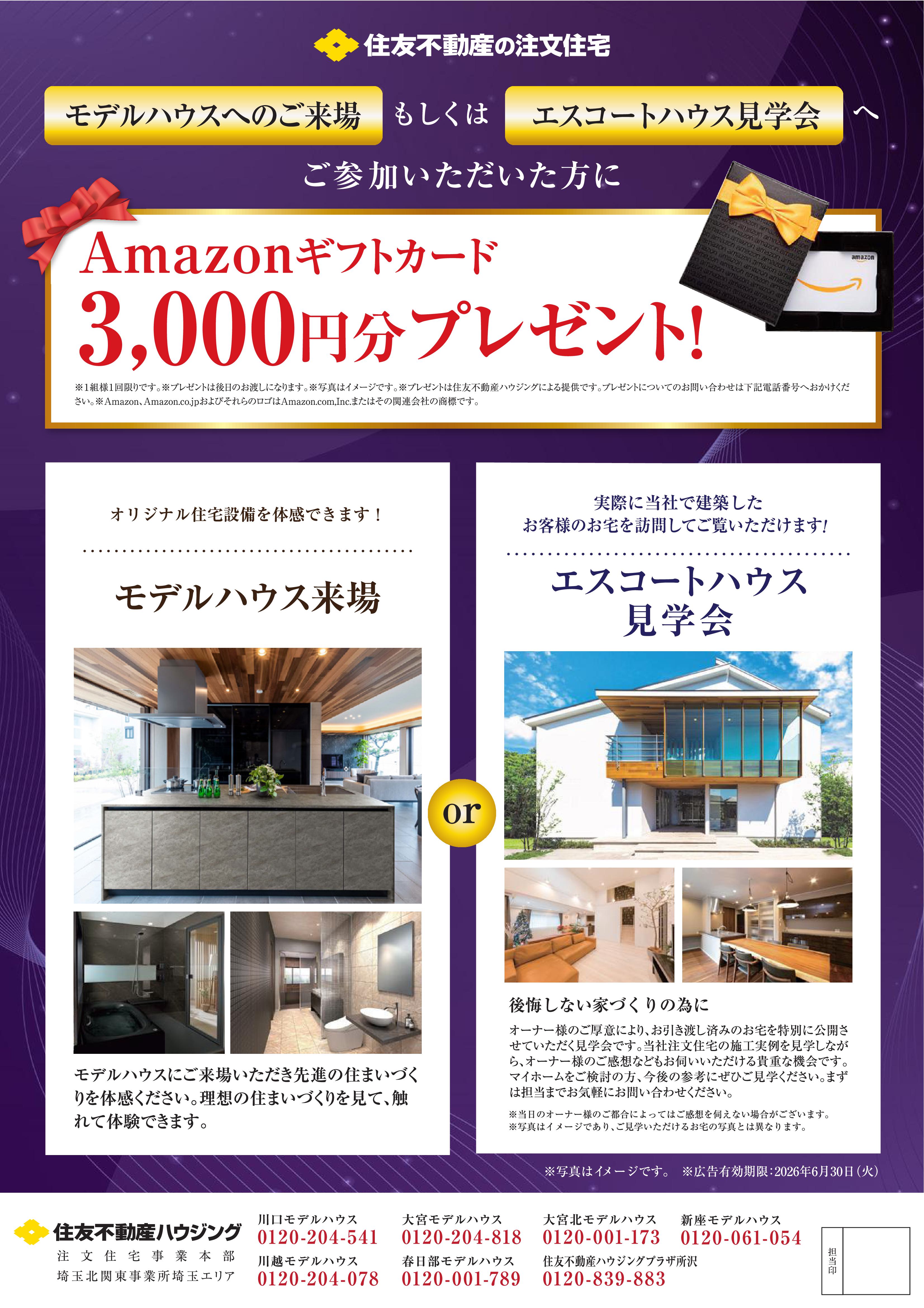 2026年6月30日(火)までに住友不動産の注文住宅のモデルハウスへご来場いただいた方、もしくはエスコートハウス見学会へご参加いただいた方に、Amazonギフトカード3,000円分をプレゼントいたします!