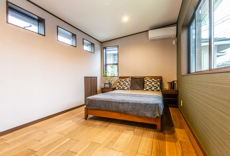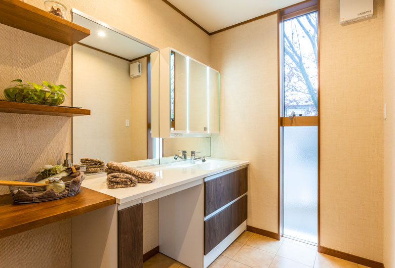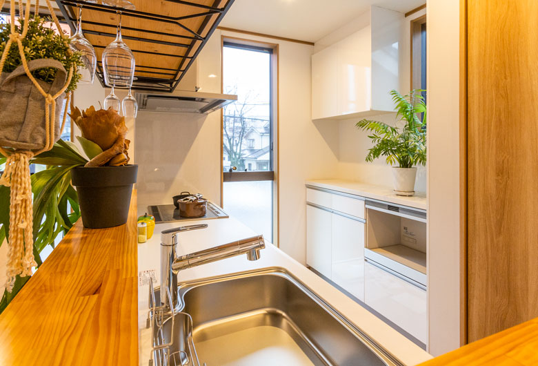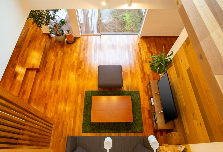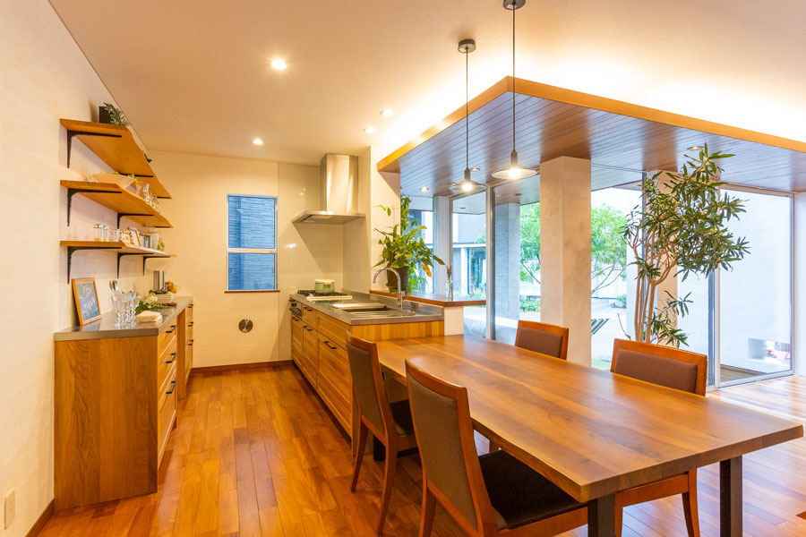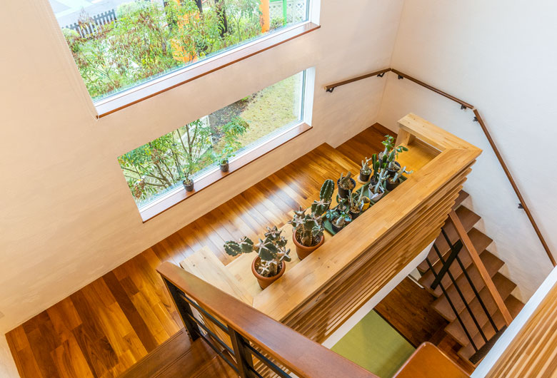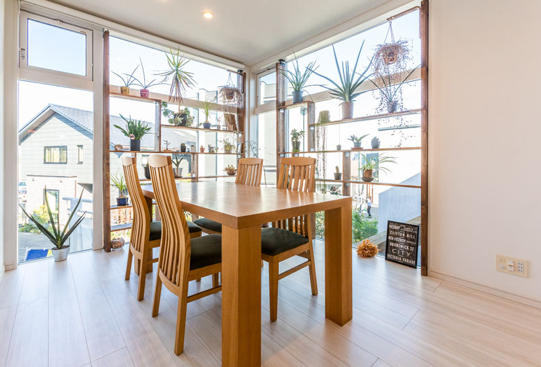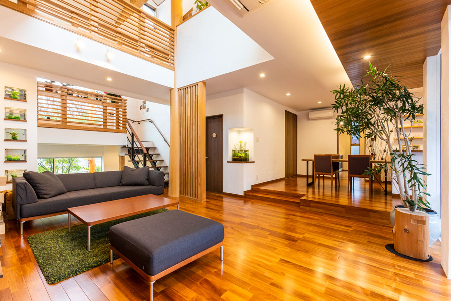 LDKは吹抜の大きな窓から暖かい日差しが差し込む家族団らんを楽しめるスペースとなっております。2階に上がる途中には中2階のスキップフロアを設け、デスクワークや植物を育てるなど様々な用途として活用頂けます。至る所に木質感を表現し、他にはない温かみのある木造住宅を最大限表現しております。在来工法ならではの真壁和室や自社専属大工が施工した様々な造作工事を体感頂けます。