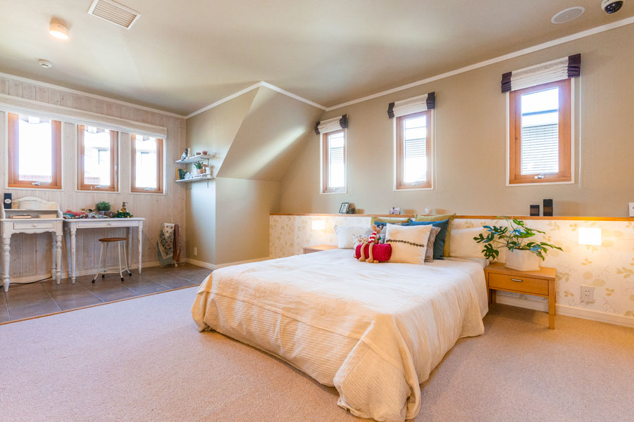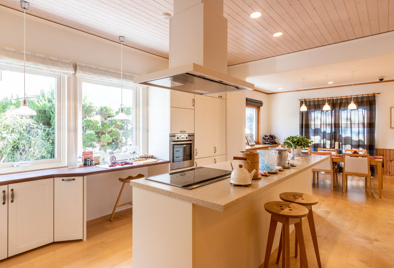 夏は涼しく、冬は暖かくを標準にてご提供しています。大屋根の存在感も可愛らしさだけでなく、圧倒的な基本性能をご体感いただけます。1階は回遊できる間取りとなっており、扉を設けオープンな空間となっています。2階には大屋根の勾配を活かした斜天井は遊び心もあり憧れる方も大勢いらっしゃいます。展示場ではスウェーデンハウスの最大の特徴である「窓」の開け閉めも体験できます。木質感と北欧デザインの調和を楽しめます。