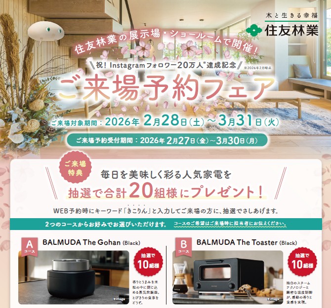 2/28(土)~3/31(日)の間にご来場予約をしていただくと人気家電をプレゼント!