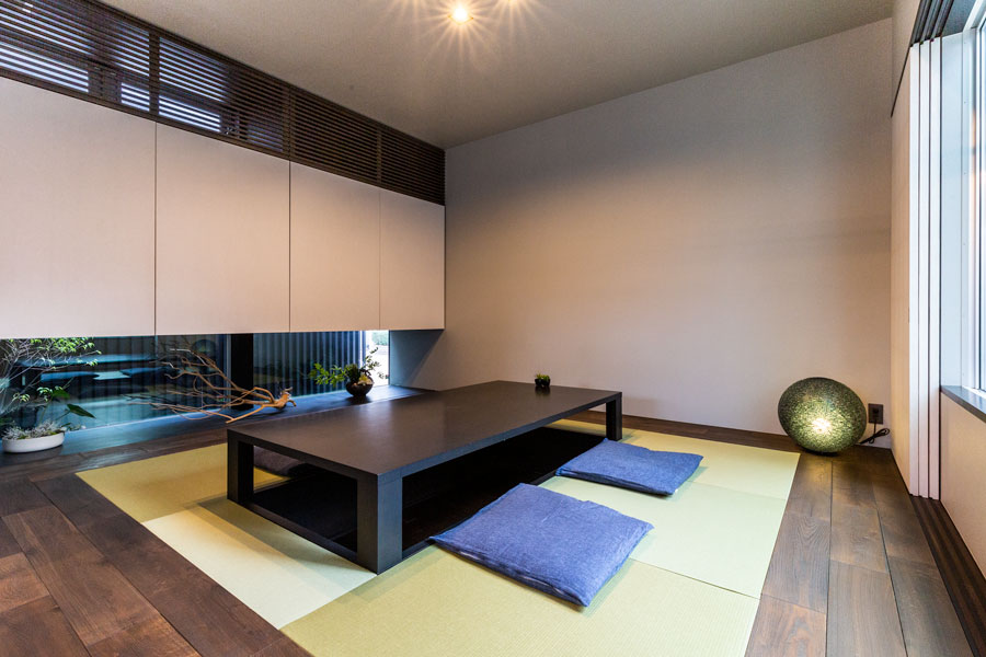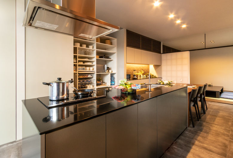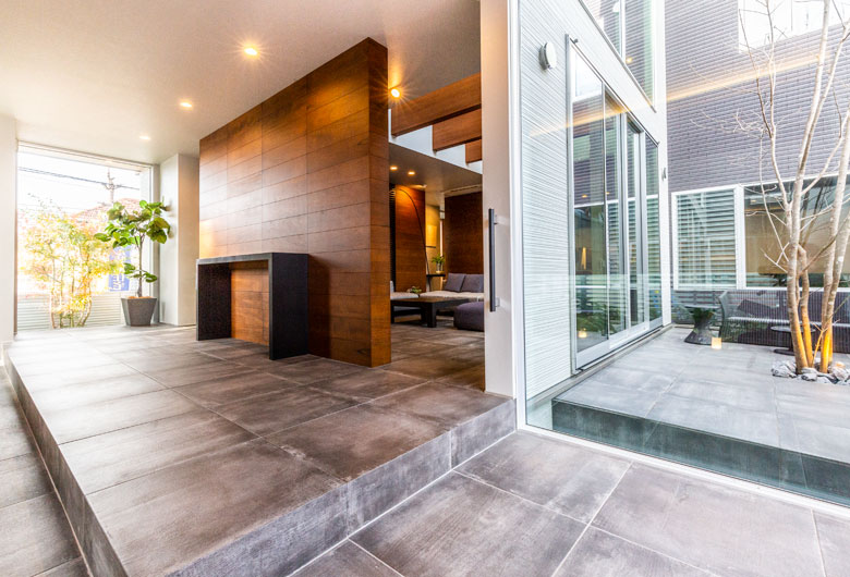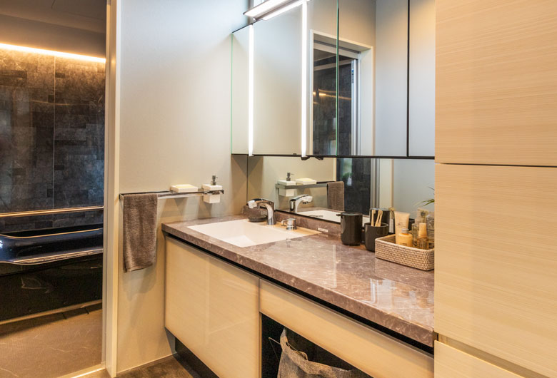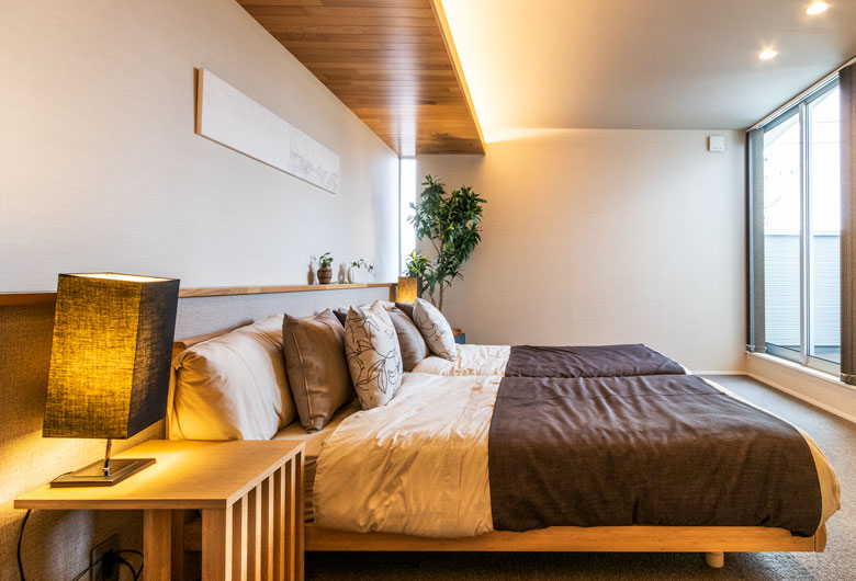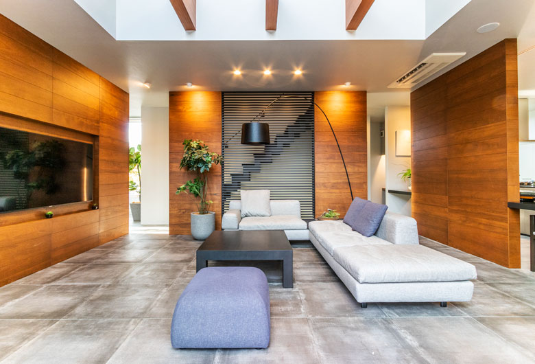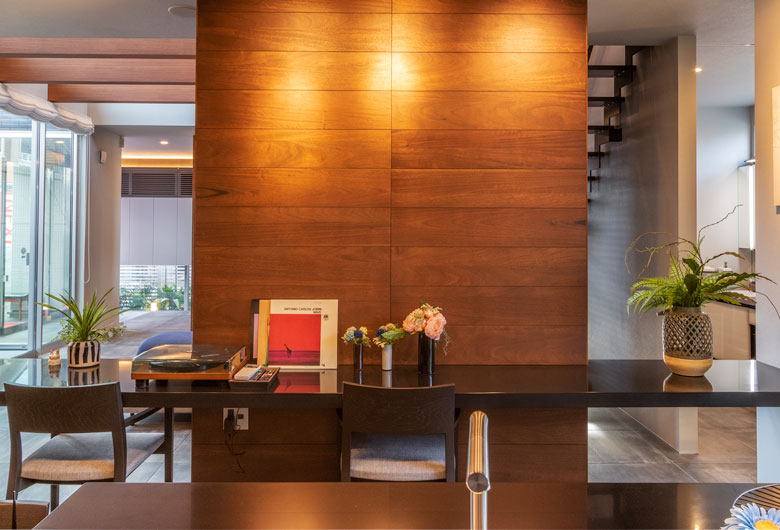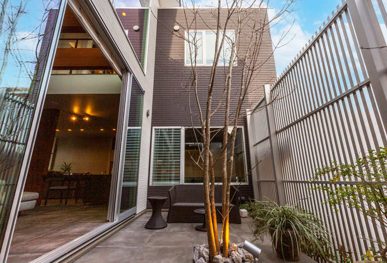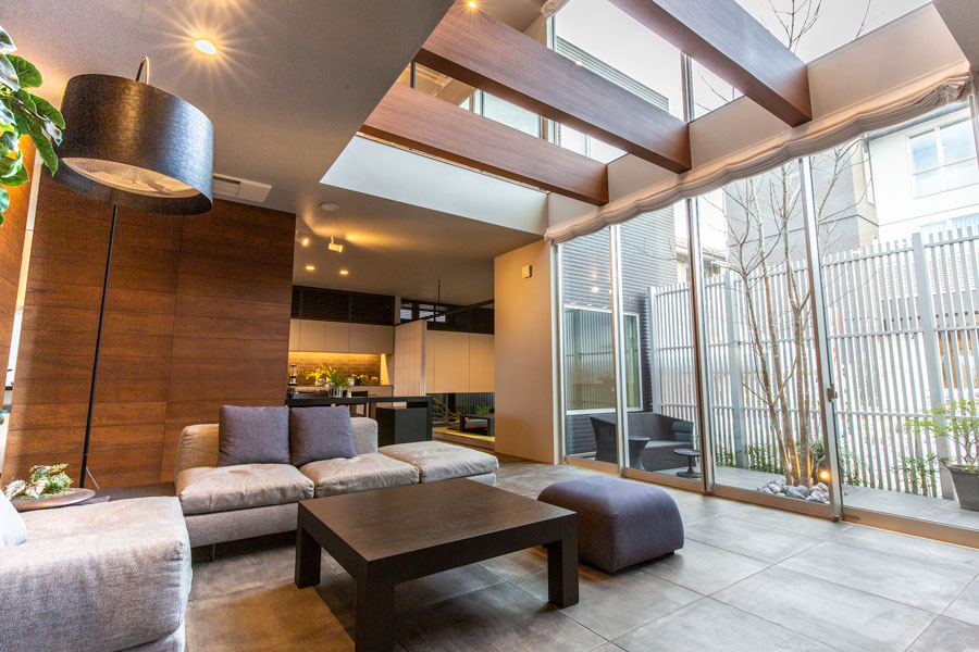 「帰りたくなる我が家。」広々とした玄関から寛ぎのリビングまで、開放的な空間を演出しています。大きな吹き抜けを介し、プライバシーを守りながら家族の気配を感じられる間取りです。またリビングと一体となった屋外テラスで、ペットと一緒に家族団欒を楽しめます。主寝室にはプライベートバルコニーを設け、周囲の雑踏から離れた癒しの空間となっています。間接照明を活用し、暖かく優しい空間となっています。