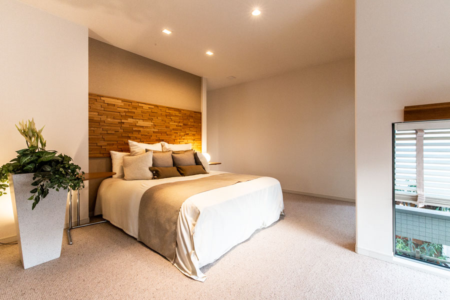 外観は低く抑えられた寄棟のルーフラインがどっしりとした安定感を演出するデザイン。軒を深く迫り出させることで、夏の強い日差しを多く取り込む。そんな日本の風土に共生する住まいを実現しています。「暮らしやすさ」「使い勝手」の提案として、広々としたLDKや効率的な家事動線が魅力の水回りをはじめ、ゆとりの広さを確保した主寝室、ロフトを採用した子供部屋なども見どころです。室内全体にあしらわれた木の風合いを感じるインテリアコーディネートもポイント。