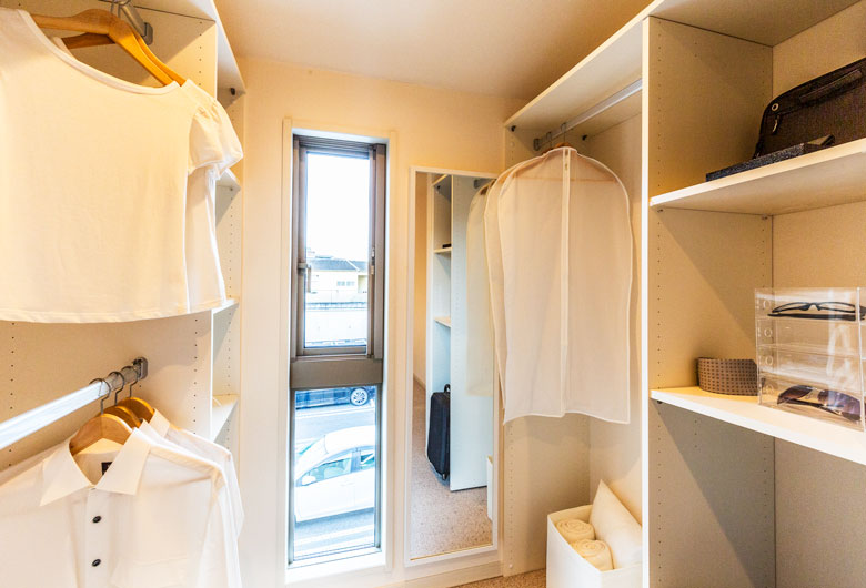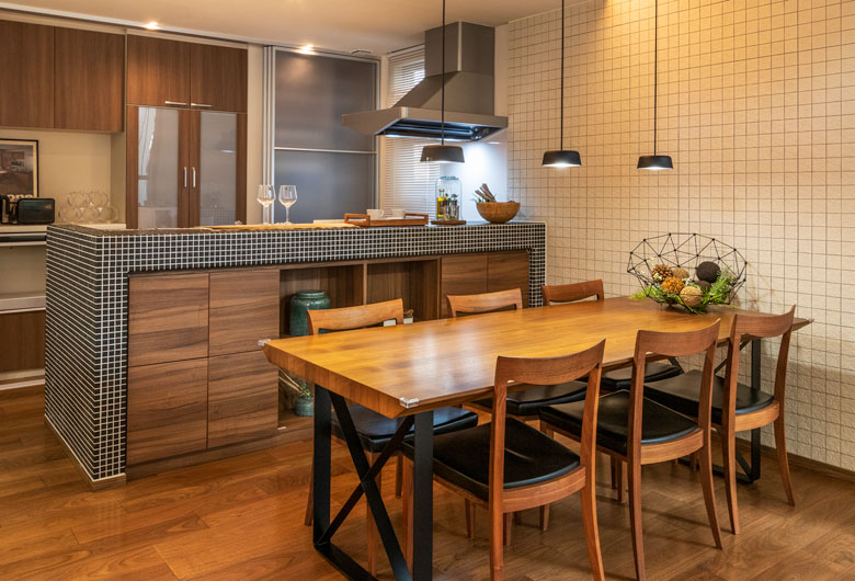 外観は低く抑えられた寄棟のルーフラインがどっしりとした安定感を演出するデザイン。軒を深く迫り出させることで、夏の強い日差しを多く取り込む。そんな日本の風土に共生する住まいを実現しています。「暮らしやすさ」「使い勝手」の提案として、広々としたLDKや効率的な家事動線が魅力の水回りをはじめ、ゆとりの広さを確保した主寝室、ロフトを採用した子供部屋なども見どころです。室内全体にあしらわれた木の風合いを感じるインテリアコーディネートもポイント。