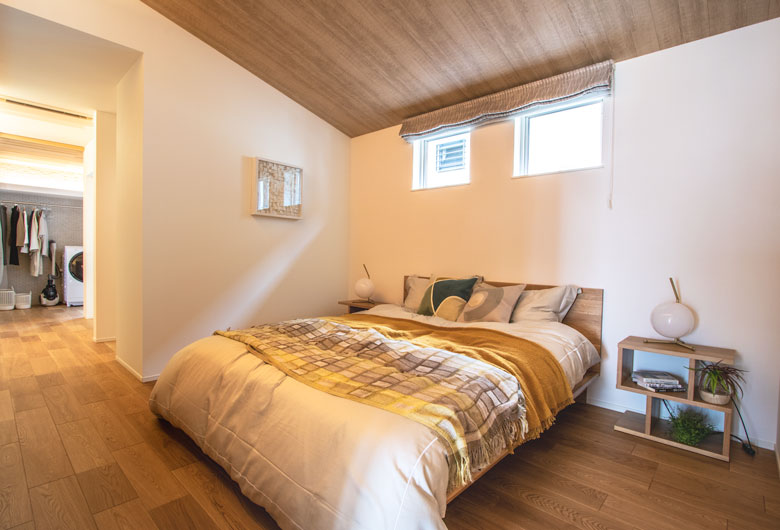 開放的で光あふれる大空間のラウンジやリビング。効率よく家事を行うために、 動線に細かな配慮がされた二世帯プランです。 親世帯が暮らす1階には、木の質感を活かした造作天井と、どこか懐かしい掘りごたつがある和室で、温かみのある家族だんらんの空間をご提案をしています。子世帯が暮らす2階は、28帖の広い空間にダイニングキッチンとリビングを設計。リビングの一角には在宅勤務にも対応できる書斎スペースや、お子様の為のスタディーコーナーも。家族が自然と集まりたくなる心地良い住まいをご提案しています。