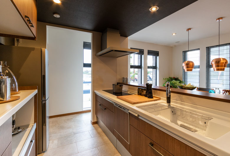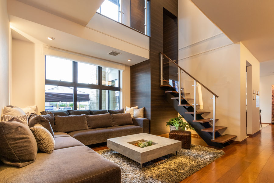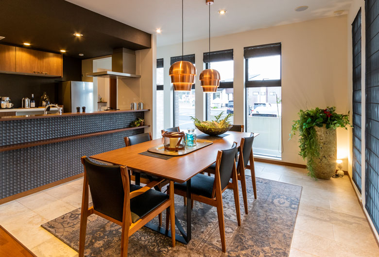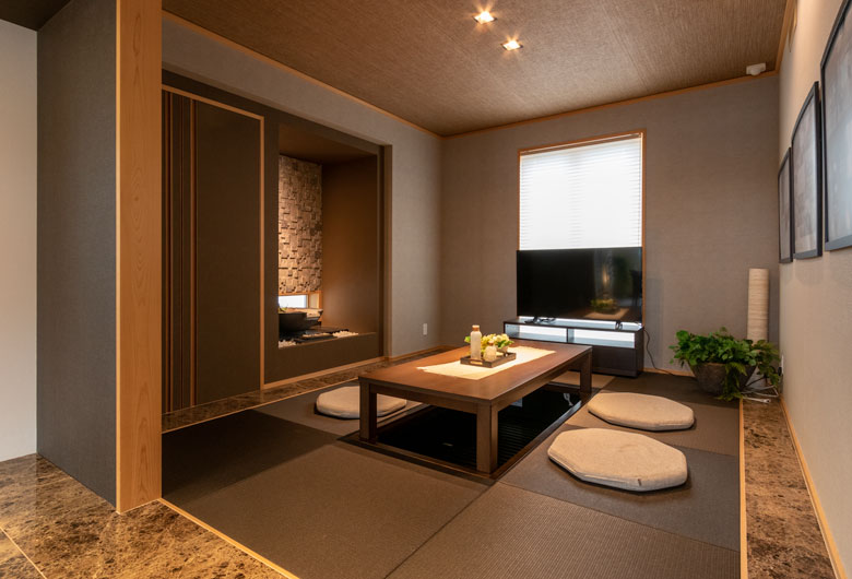 外壁にはスクラッチブリックタイルと自然石のような風合いのタイルをあしらい、内部はダークブラウンを基調としたラグジュアリーなインテリアでコーディネートをしております。また、キッチンを中心にリビング、ダイニング、和室を配置し、日々の暮らしを豊かにする使いやすさのアイデアをご提案させて頂いております。