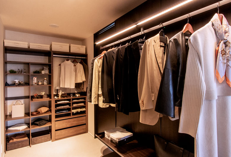 □1階リビングの天井は梁を現し、優しい色のタイルで空間にアクセントをつけました。南北の窓は住友林業の「ビックフレーム工法」を活かした大開口とし、家と庭の繋がり、また風通しを意識した空間設計としました。□2階は家事に便利な【寝室~クローゼット~洗面室~バルコニー】の動線。さらに住友林業の情報が学べる「コンサルティングルーム」を設けております。
