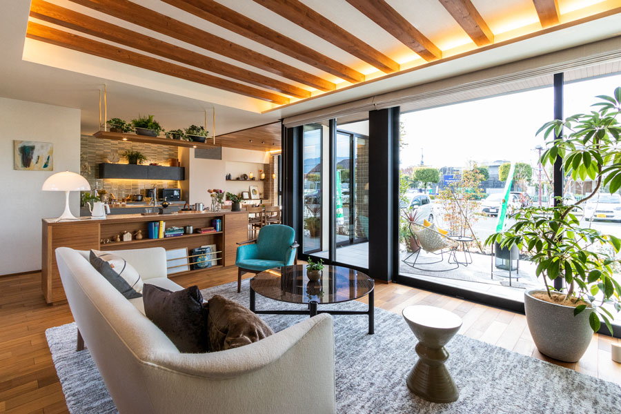 住友林業の新商品『MyForest BF』、木質感のある柔らかいデザインの展示場です。内、外装に木調・木製部材を用いることで親しみやすい雰囲気になっています。