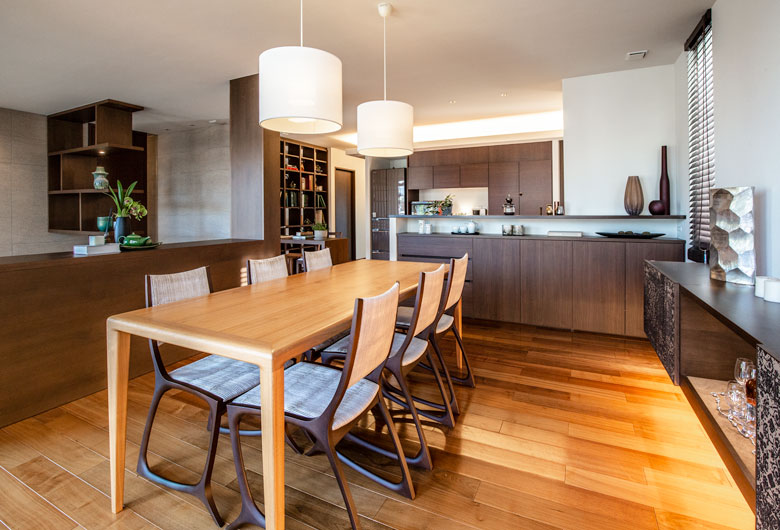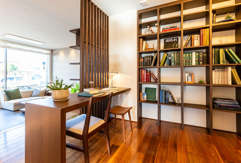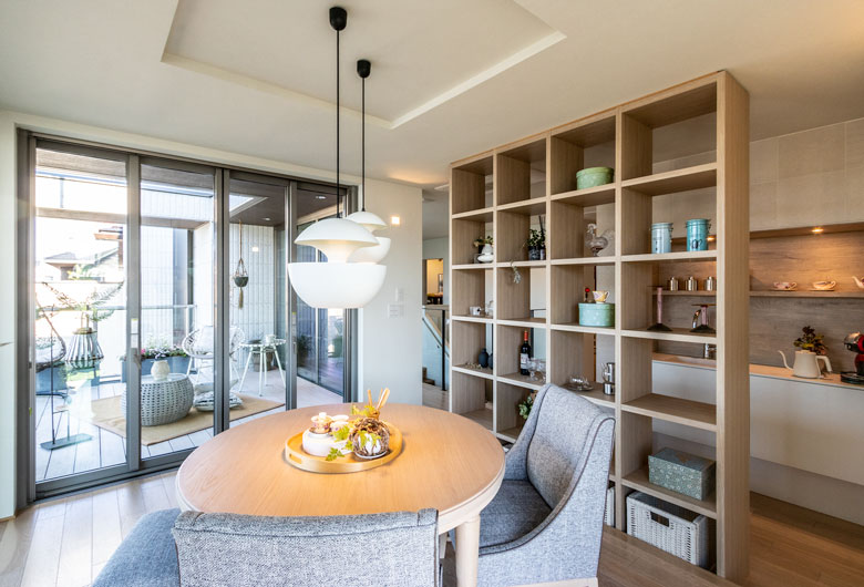 圧倒的な設計自由度で、住みやすさを追求した3階建て二世帯住宅の間取りです。単世帯の方にも二種類のキッチン、スタイルの違うリビング、お風呂、インテリアなどご参考にして頂けます。親世帯スペースでは、シューズクローク、床を下げたリビング、階段下の活用、ホテルをイメージさせる寝室がご好評いただいております。共働きの子育て世代をイメージした子世帯スペースでは、家事動線や、収納の工夫、+αの空間を楽しむご提案をご覧いただけます。