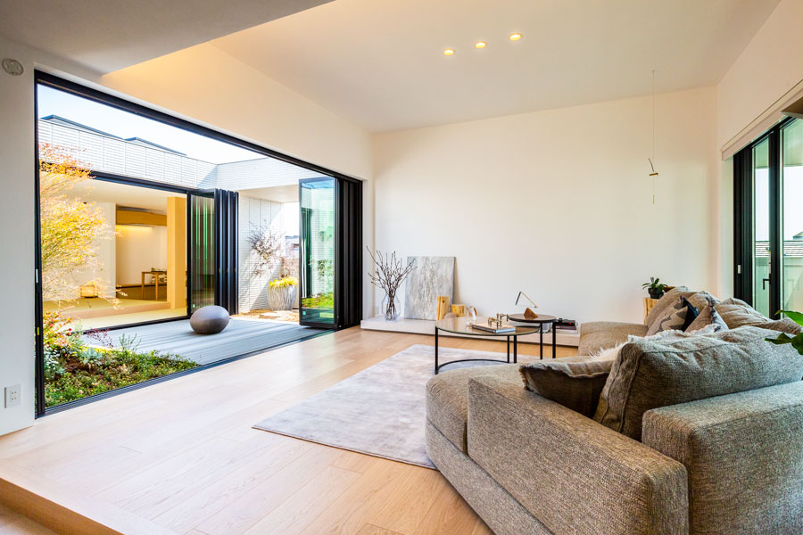 多様化する暮らしに合わせ、屋内外の境界を曖昧にすることで、家にいながら外の景色を楽しむことができる空間を実現しました。