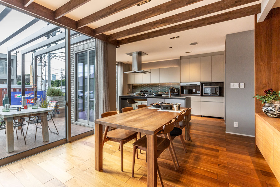 LDKをそれぞれのフロアに分離し独立性を高めながらも、吹抜けで繋がるプラン。独自の全館空調システム「エアロハス」を2,3階空間に搭載。徹底的に浄化された空気で室内を満たし、温度を「バリアフリー」に。オールシーズン・24時間、快適温度を実現します。「強さ」と「暮らしやすさ」の№1を目指すパナソニックホームズ。その技術や多彩な知恵を、展示場でご体感下さい。