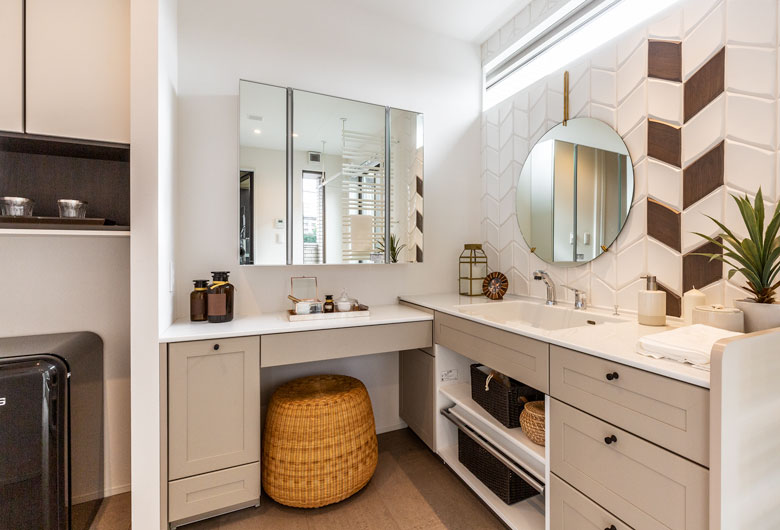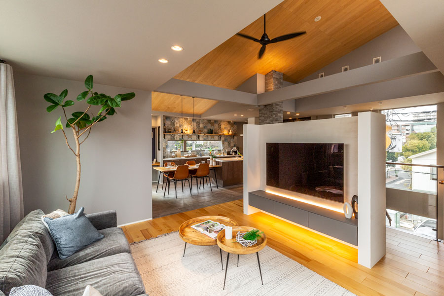 LDKをそれぞれのフロアに分離し独立性を高めながらも、吹抜けで繋がるプラン。独自の全館空調システム「エアロハス」を2,3階空間に搭載。徹底的に浄化された空気で室内を満たし、温度を「バリアフリー」に。オールシーズン・24時間、快適温度を実現します。「強さ」と「暮らしやすさ」の№1を目指すパナソニックホームズ。その技術や多彩な知恵を、展示場でご体感下さい。