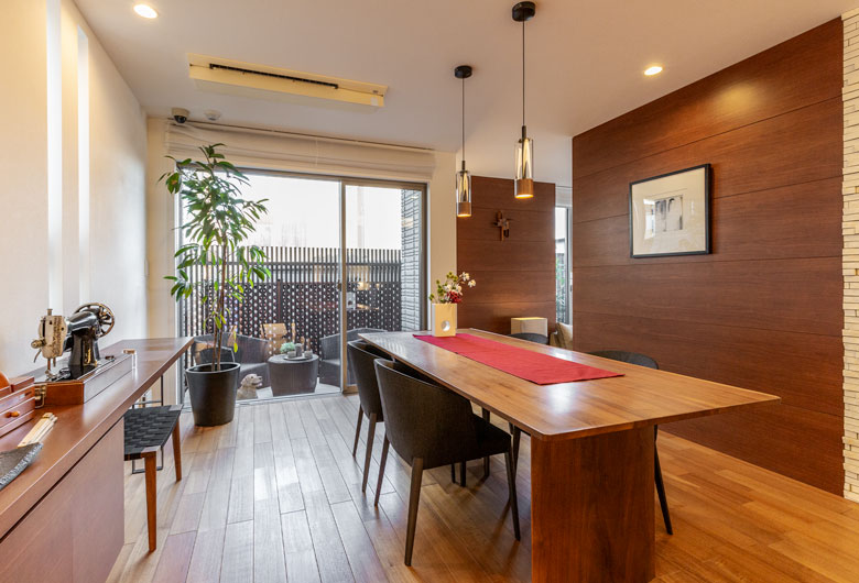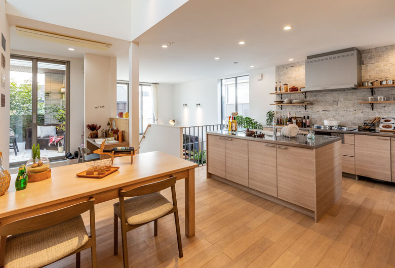 1階は落ち着いたウッド調の、大人の空間で、自然とみんながくつろげるダウンフロアリビングが見所です。2階は対象的にさわやかで明るいオープンなダイニングキッチンが中心です。1階と2階をゆるやかにつなぐスキップフロア、開放感が最高に気持ちいい屋上空間を、ぜひ体験しにいらして下さい。