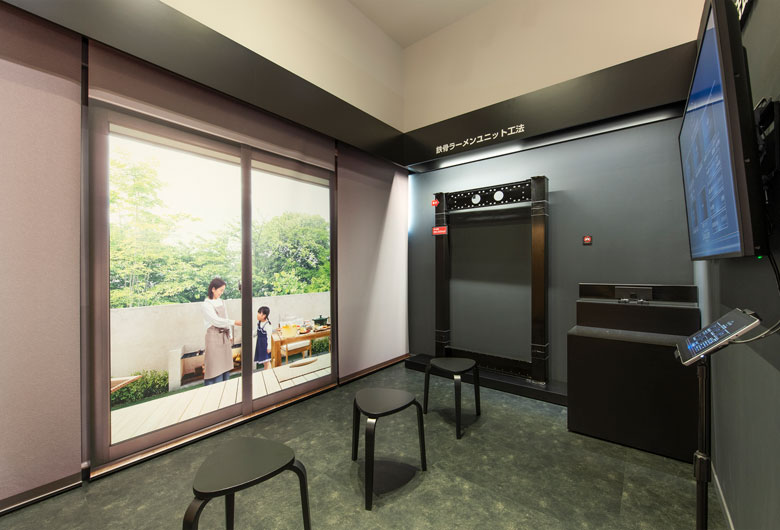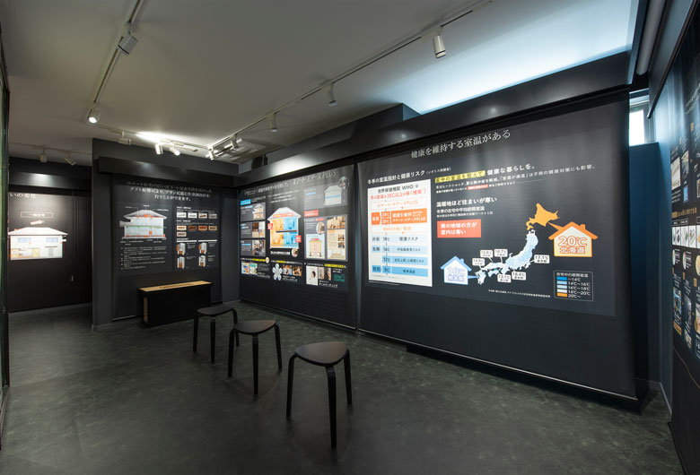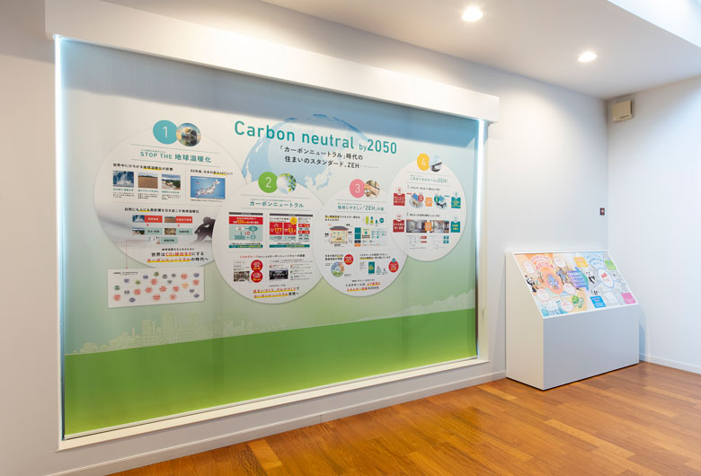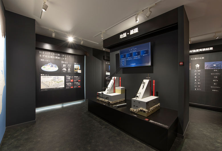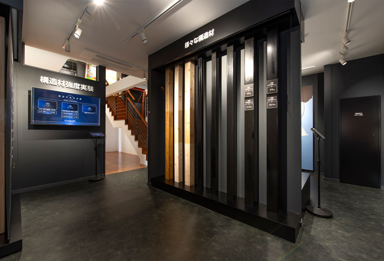 大画面シアターや構造材実験で、住まいづくりを楽しく学べるショールーム。
