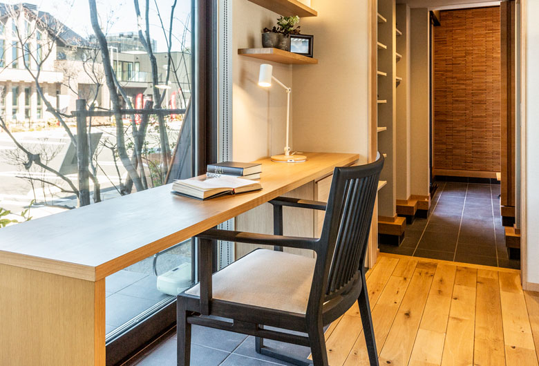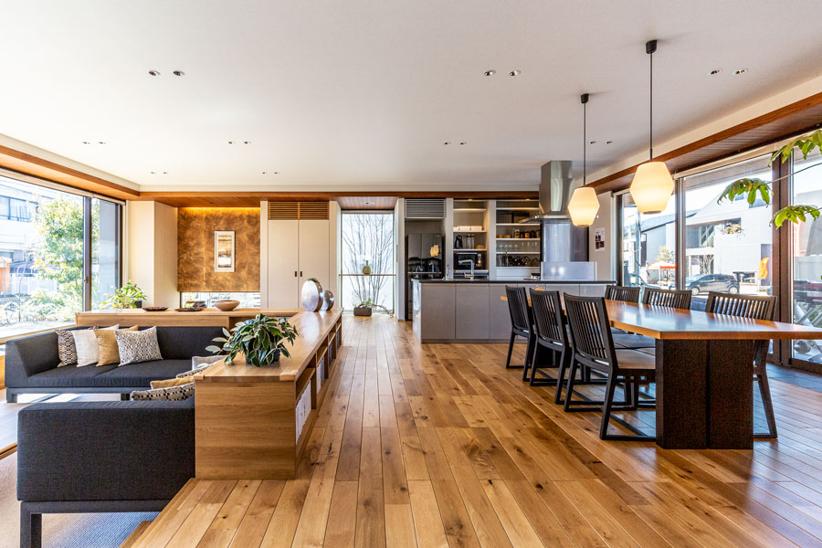 自然美と伝統美を備えた和の趣の中に融合された和モダンの住まいには国産ナラの無垢材を贅沢に採用