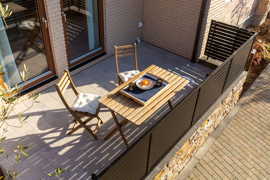 夏・冬と使え分けが出来るサンデッキとテラスご提案。夏の強い日差しの日は日陰のテラスへ、冬の暖かい日差しの日はサンデッキを利用する。一年通して季節を屋外で楽しむそんな暮らしが似合う住まいです。