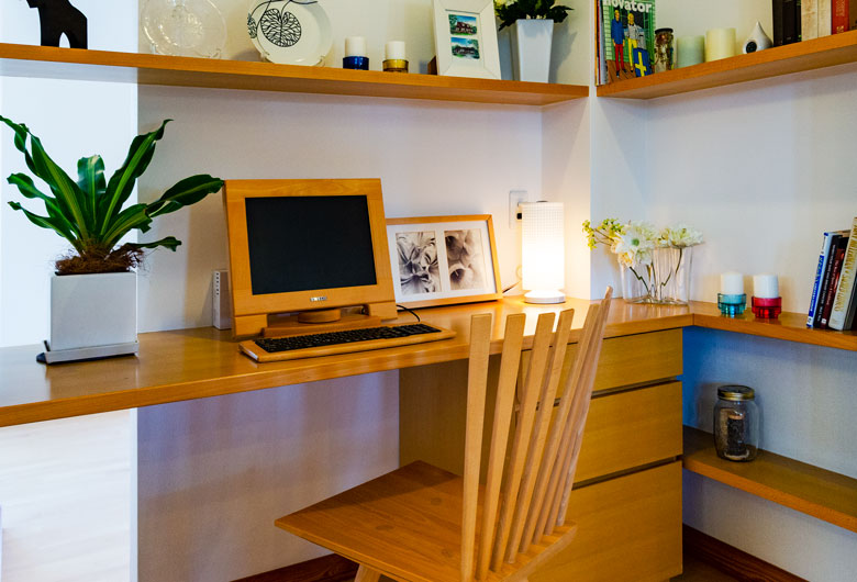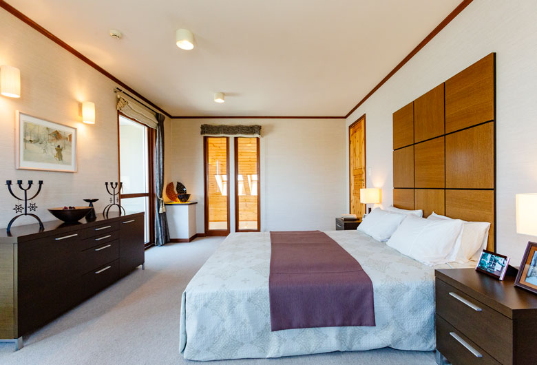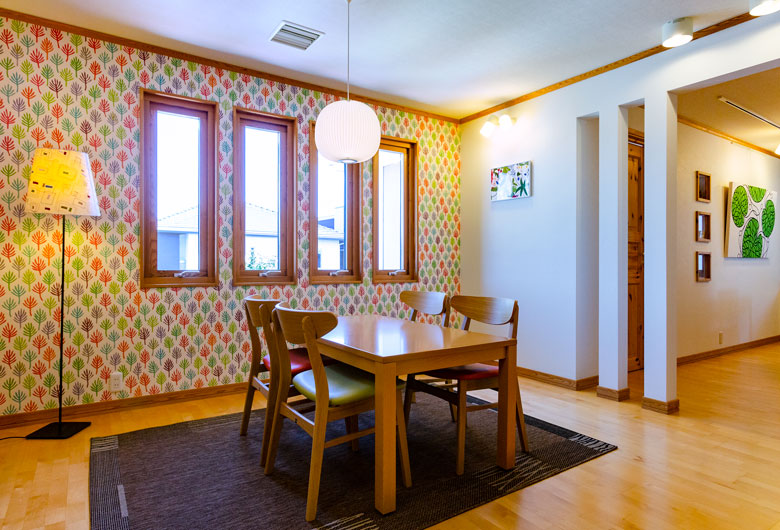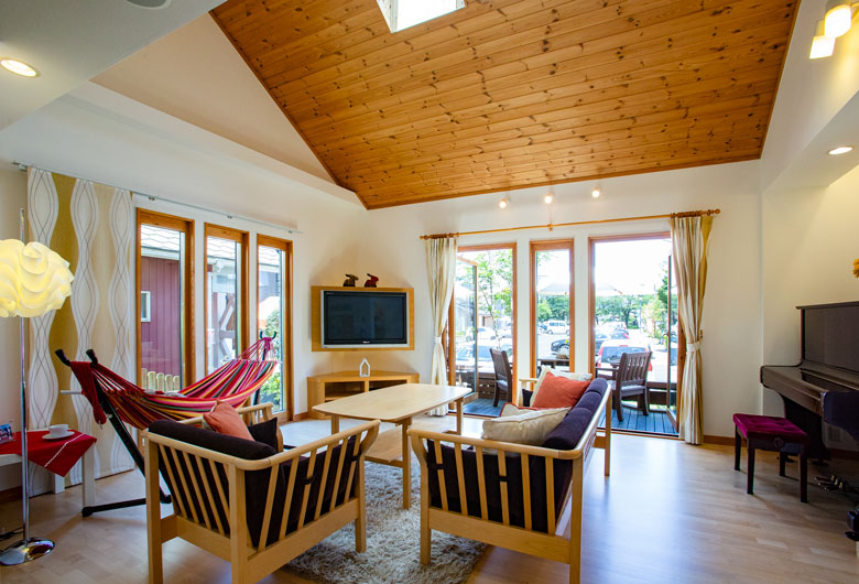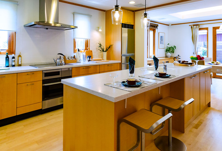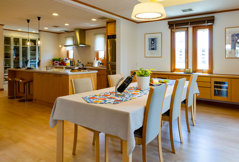 リビングからダイニング、キッチンまで回遊性の高いオープンスペースにする事で魅力的な大空間を生み出しています。リビングはダイナミックな斜天井となっており解放感を感じて頂けます。またキッチンはアイランドキッチンを採用し大きなパントリーも装備した夢のある空間となっています。天然木の窓サッシと3重ガラス窓により沢山の光を取り込みながらも外気に左右されない性能の高さが最大の特徴です。木質感あふれる優しい雰囲気と深呼吸したくなる空気感を感じて頂けます。
