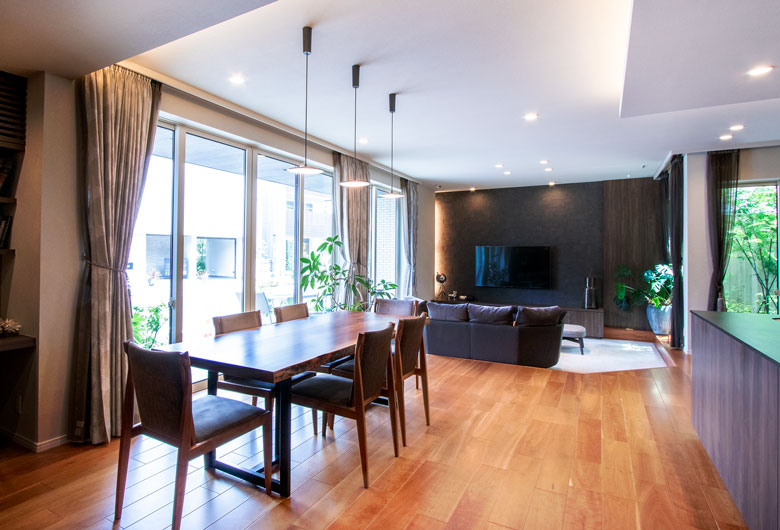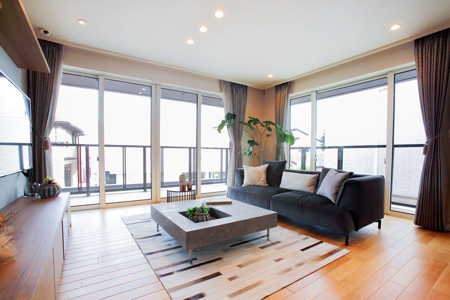 深い軒や庇で強調されるダイナミックな水平ラインが邸宅としての落ちつきを演出します。全面、光触媒タイル外壁が新築時の美しさを保ったまま長く暮らせる、機能的で素敵な二世帯住宅モデルです。 各部屋毎にこだわった内装インテリアで上質なくらしを実現します。