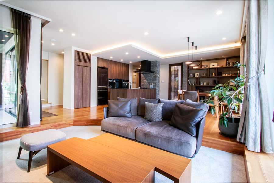 深い軒や庇で強調されるダイナミックな水平ラインが邸宅としての落ちつきを演出します。全面、光触媒タイル外壁が新築時の美しさを保ったまま長く暮らせる、機能的で素敵な二世帯住宅モデルです。 各部屋毎にこだわった内装インテリアで上質なくらしを実現します。