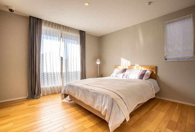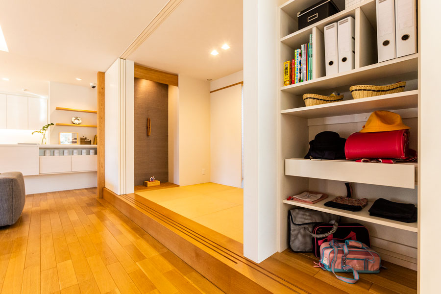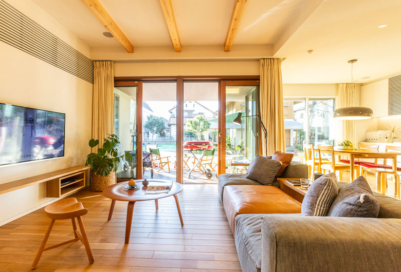 女性がもっともこだわりたいリビングに余計なものや家事を持ち込ませず、奥様のくつろぎの時間を生み出すために、併設する空間や収納をプランで提案しました。インテリアは使うほどに味わいを感じられる、ナチュラルテイストの北欧エッセンスとしました。ナチュラルオークフロアやkikoの窓(木製窓)、化粧梁など自然で風合い良く、時を経て味わいを増す部材としています。