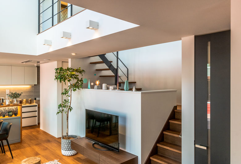 スキップフロアや趣味空間としても使えるミセスコーナー、小上がりの和室など、自由設計ならではの暮らしを豊かにしてくれる間取りが特徴です。また開放感溢れる吹き抜け+スキップフロアの組み合わせも必見です。