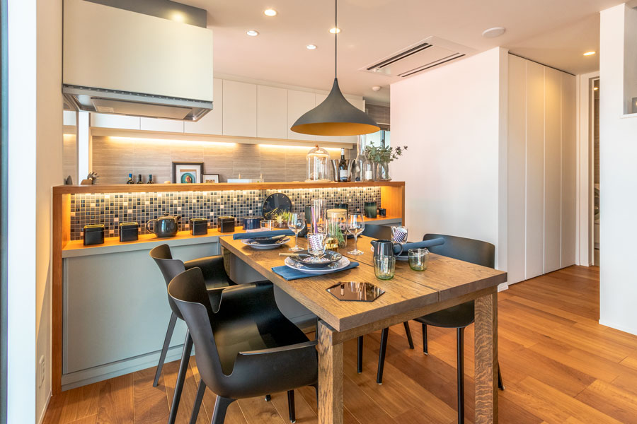 室内のコーディネートにもこだわり、キッチンカウンターのモザイクタイルや、「黒」×「グレー」を取り入れてモダンな雰囲気に仕上げたダイニング、ホテルライクなサニタリースペースでは、空間をスタイリッシュに演出しました。