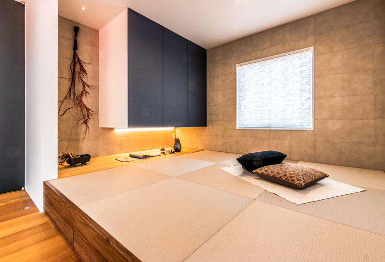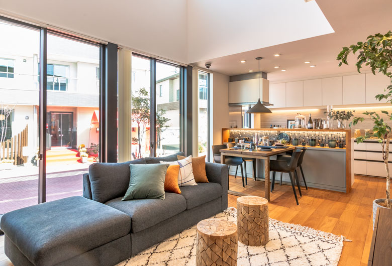 室内のコーディネートにもこだわり、キッチンカウンターのモザイクタイルや、「黒」×「グレー」を取り入れてモダンな雰囲気に仕上げたダイニング、ホテルライクなサニタリースペースでは、空間をスタイリッシュに演出しました。
