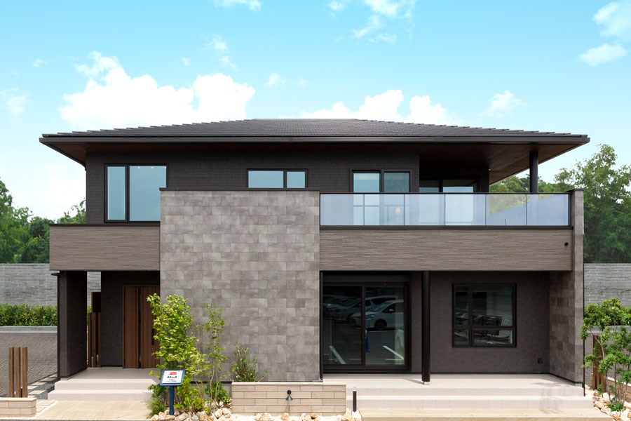 外観は落ち着いた色合いでダンディなテイストに、内装はグレーを基調としたカラーリングでモダンな落ち着きのある空間を演出。トリプルサッシも採用した高断熱仕様のモデルハウスです。