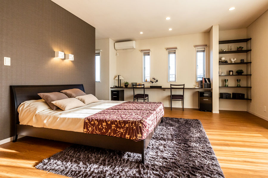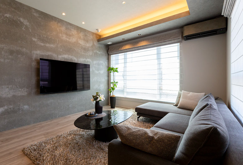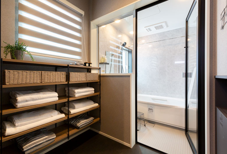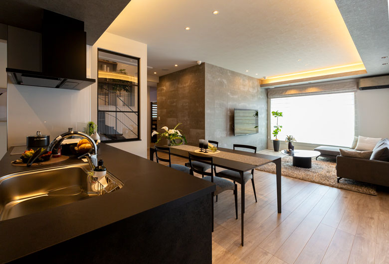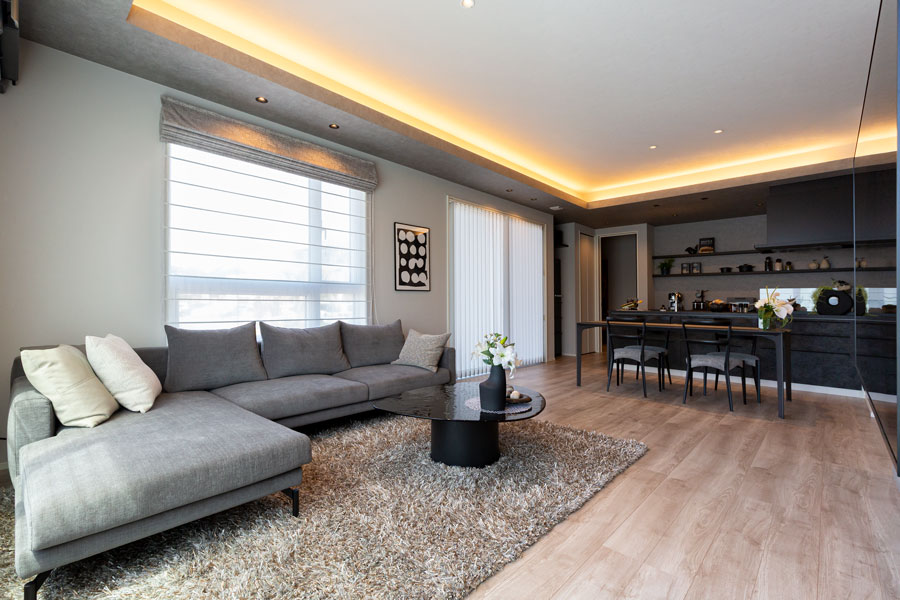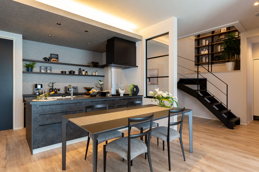 外観は落ち着いた色合いでダンディなテイストに、内装はグレーを基調としたカラーリングでモダンな落ち着きのある空間を演出。トリプルサッシも採用した高断熱仕様のモデルハウスです。