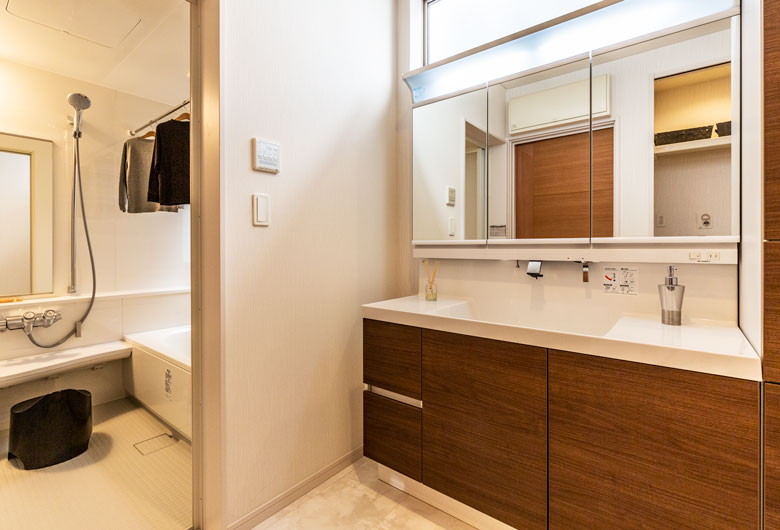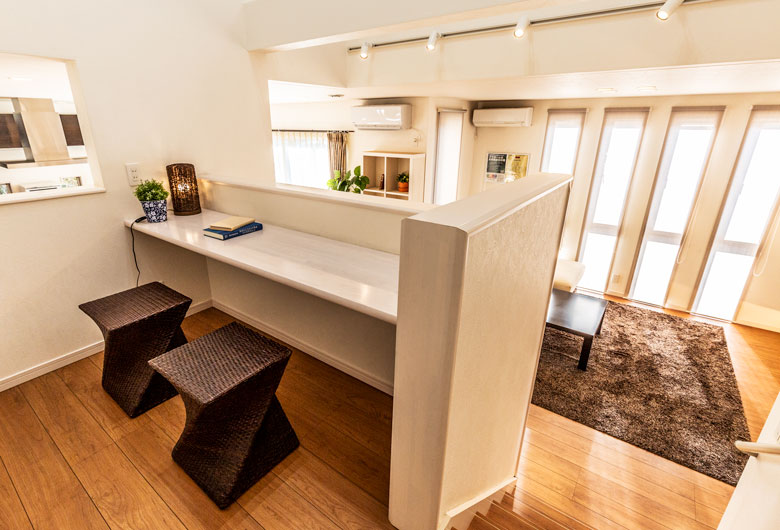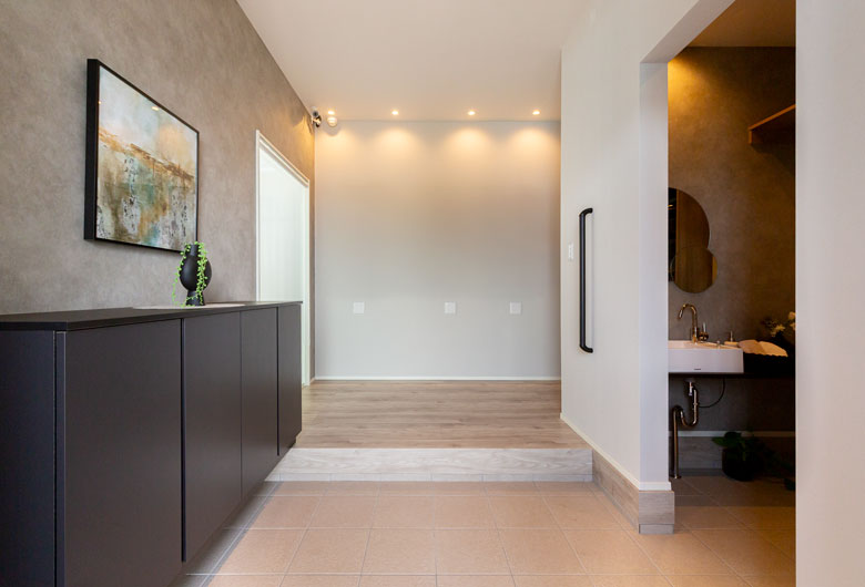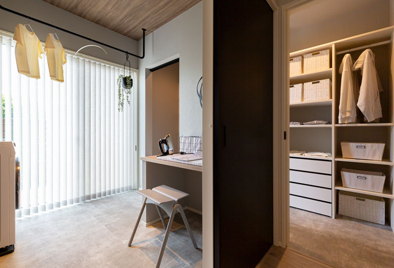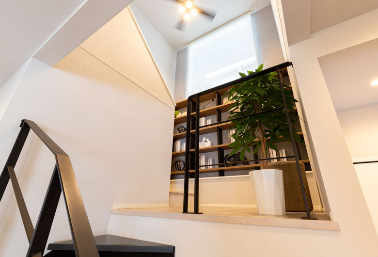 ランドリールームやファミリークロークを取り入れた、使い勝手の良い動線を取り入れたモデルハウス。1階LDKは天井高2.7m、階段にあるスキップフロアでも開放感を演出。