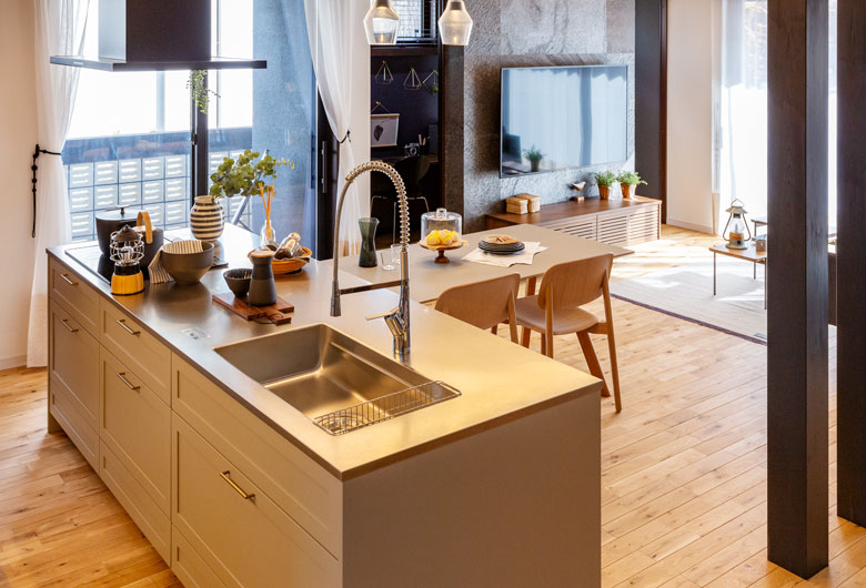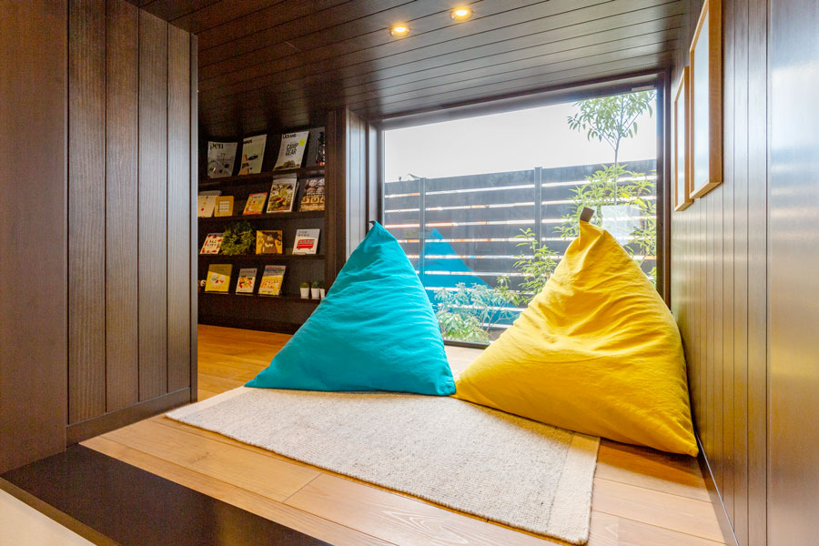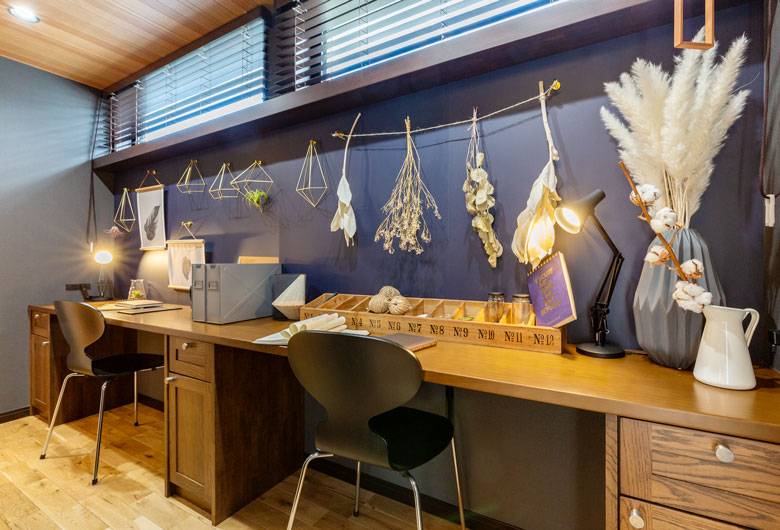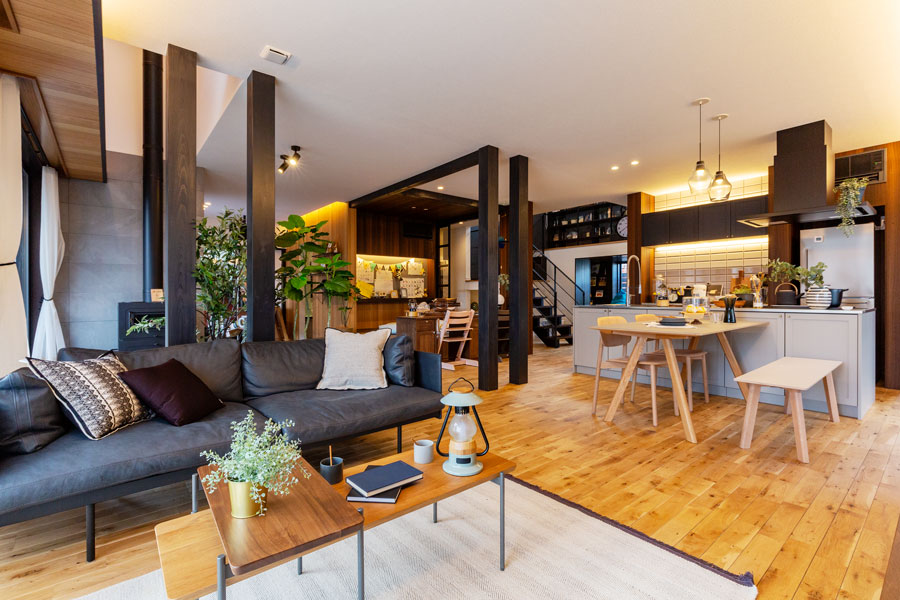 家族でおうち時間を楽しみながら、働く・育む・遊ぶが一緒になった「トモラクの家」。家族みんなが家事をシェアするスムーズ動線や親子で料理を楽しみ自然と会話が弾むアイランドキッチンなど家族いっしょの時間が増えるLDKになっています。リビングの一角には家族の気配を感じながら仕事に集中できるテレワークスペースを配置。また趣味を愉しむビルトインガレージ、手軽におうちアウトドアをを愉しめるウッドデッキやベランピングスペースなど休日の家族のコミュニケーションが増えるおうちになっています。
