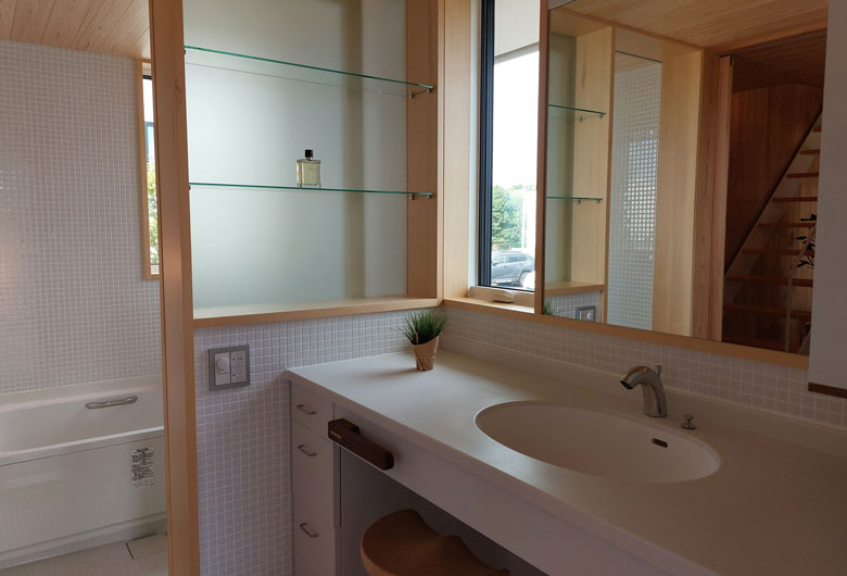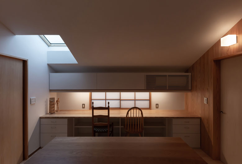 家全体を見渡せるほど広々とした吹き抜けが生み出す開放感が気持ちいい室内。扉はすべて壁の中に入る引き戸にしているので家中の空間が緩やかに繋がります。外部との繋がりも味わえるよう、リビングの掃き出しにはこだわりの木製サッシを使いフルオープンに。暮らしやすさを左右する動線は短くコンパクトに。キッチン、リビング、ダイニング、廊下と行き止まりがなく家の中をぐるぐる動き回ることが出来る間取りなら効率よく家事を進めることができます。天井高を低くし美しさを際立出せた外観もみどころです。