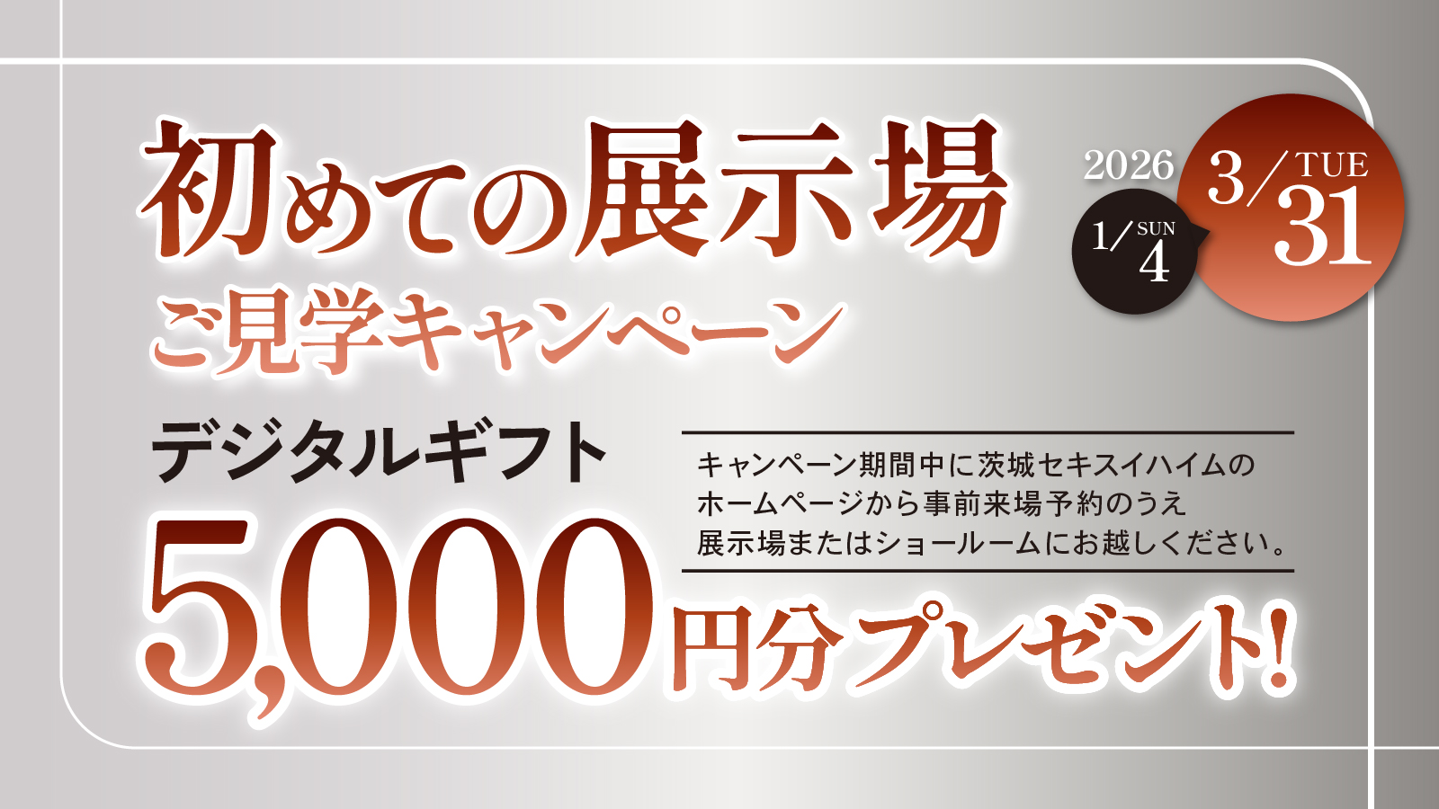 事前来場予約のうえ、展示場またはショールームにおこしいただくと「デジタルギフト 5,000円分」をプレゼント!