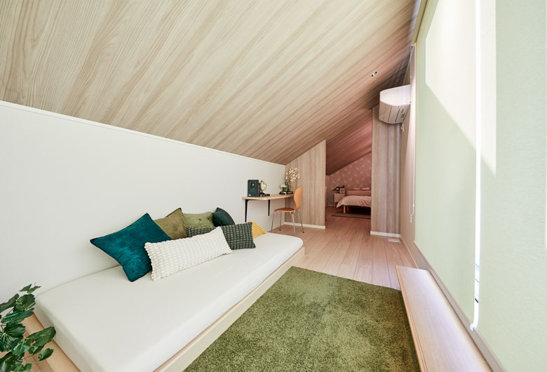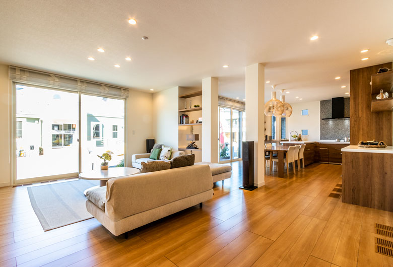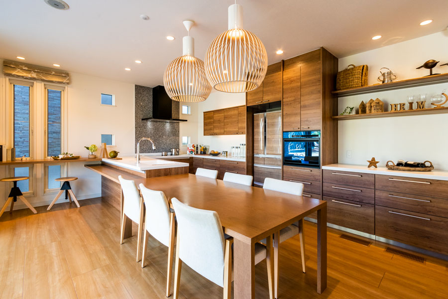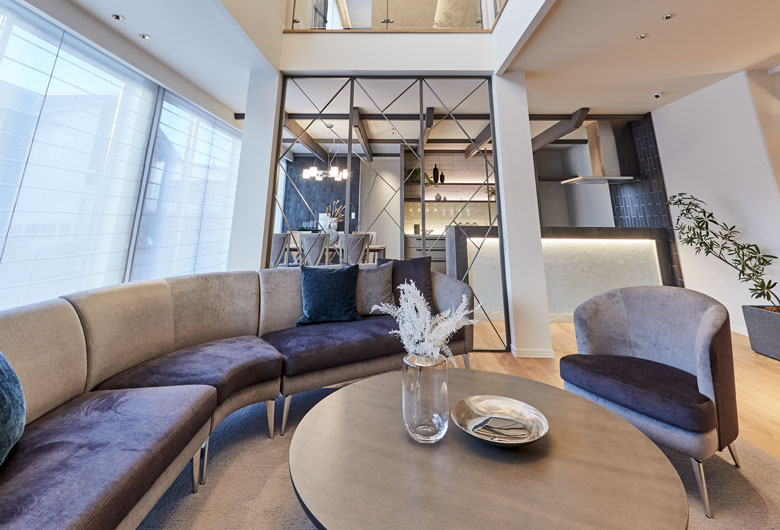 家づくりの大半を工場で行い、60年以上安心して快適に住み続けることが可能。自然素材の豊かな風合いを感じながら、アイアンの洗練されたアクセントを取り入れ、異素材を巧みに組み合わせた空間を演出。家具には木目を活かしたグレーカラーを採用し、温かみのあるナチュラルな雰囲気を演出します。さらに広々としたオープンスペースと大きな窓から差し込む自然光が、内と外をつなぐ心地よい空間を生み出します。