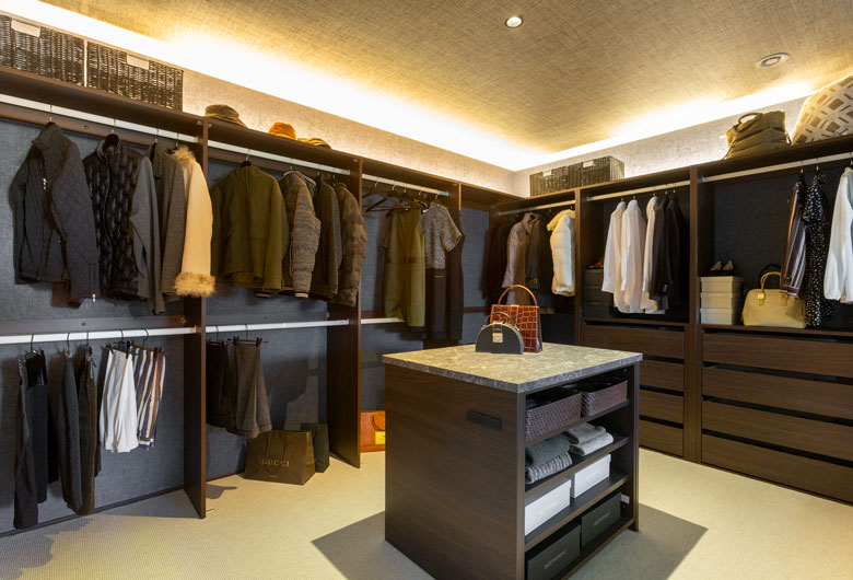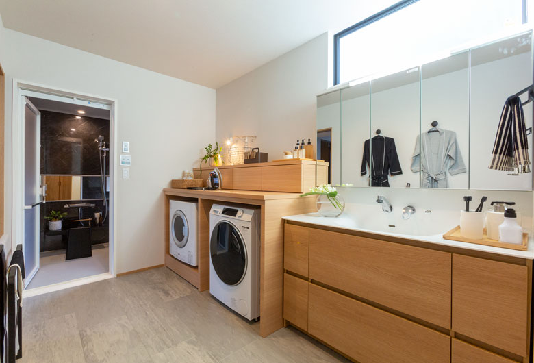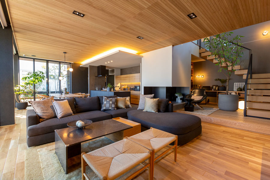 『ビッグフレーム構法』ならではの大開口によって、角地という立地を活かした開放的な空間を実現しました。1階は、テラスとの繋がりを持たせ外にいるような広がりある空間を創出。2階は開口部と軒に連続性を持たせる事で1階同様の開放感を実現。外観は木調格子やタイルなどの表情豊かな素材を組み合わせ、重厚感の中にも木質感や柔らかさを感じられるように演出しております。現代の暮らしを配慮した設計に本物の素材を取り入れた、恒久的に親しめる住まいをご提案しております。
