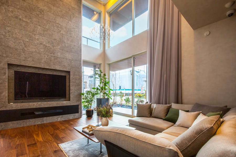 大きな吹抜けは構造の強さの証。空間での温度差の少ない全館空調をご体感下さい。