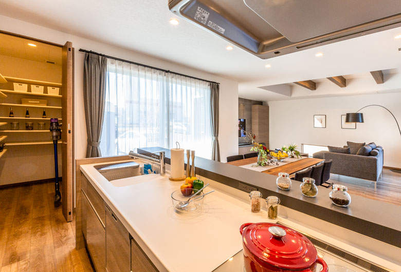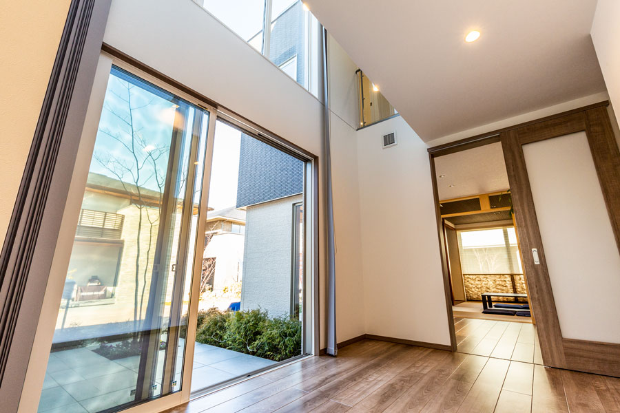 「外に閉じ、中に開く」外観からは想像も出来ない広がりがLDKには感じられ、吹抜けから射し込む光が、まさに心地良い安らぎの空間となっております。皆様のご来場、心よりお待ち申し上げます。
