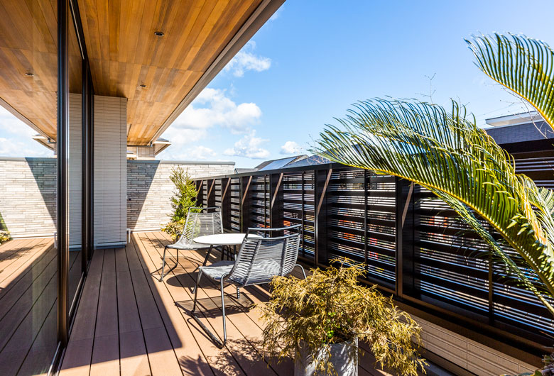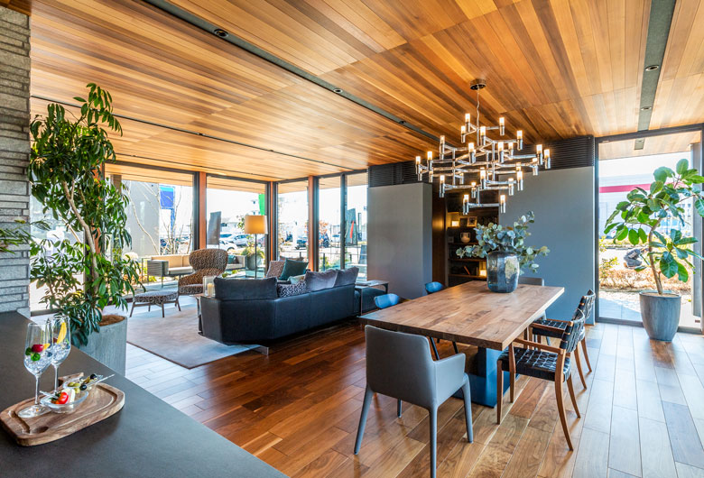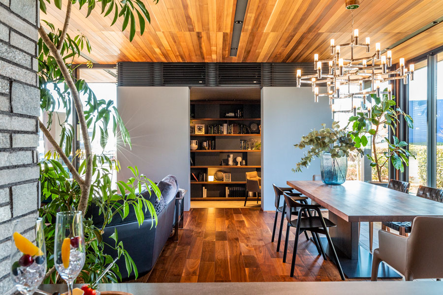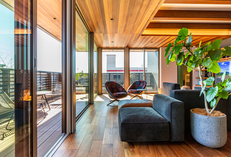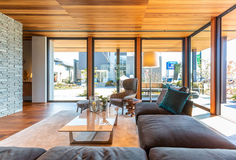 『大開口×大空間』 屋内外の天井・床の仕上げ材と高さを揃え、天井まで達する大開口サッシを連続させて計画。光や風、視線が透き通る開放的な空間を実現する「クリアビューデザイン」により、1階ではアウトダイニングと一体化空間となる38帖越のリビング・ダイニング。2階ではフルフラットバルコニーとつながる心地よい開放感を愉しむ憩いのラウンジにて優雅な大空間をご体感いただけます。