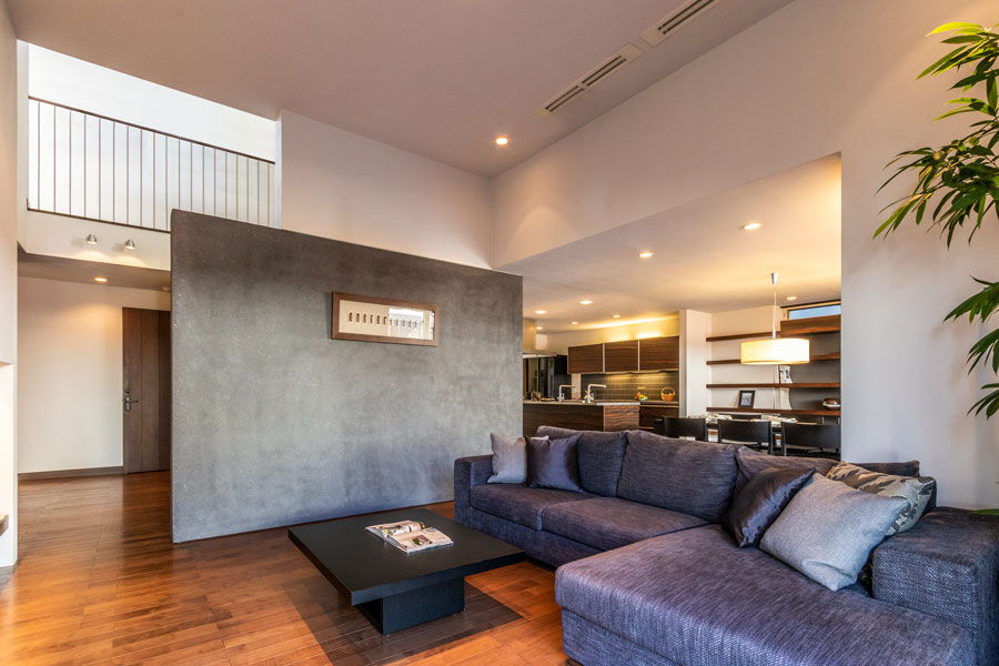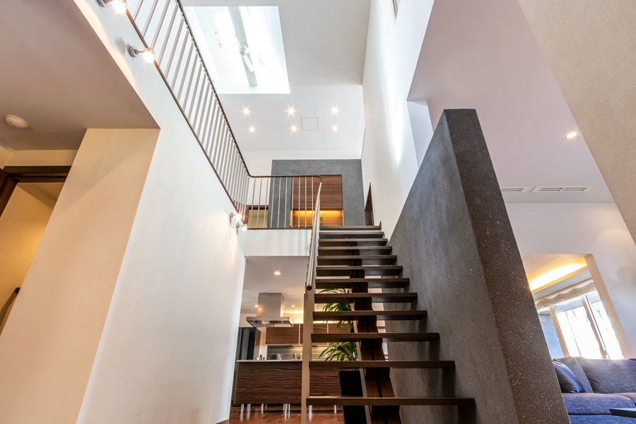 特徴は、2階建てなのに3階建てのような「蔵のある家」です。大きな吹抜けホール、余裕のある大収納空間と3.2メートルある高天井のリビングで、ゆっくりとおくつろぎいただけます。