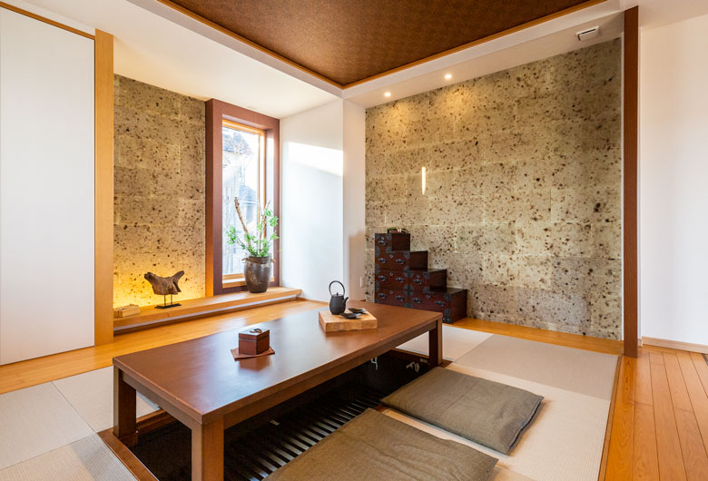 ナチュラルな木肌の風合いが印象的な床材や家具を取り入れた落ち着きのあるインテリアコーディネートが魅力。1階の間取りは、視覚的にも開放感を演出するワンルーム構成のLDKを中心に、ユーティリティやスタディコーナーを設置。また和の象徴ともいえる和室は、あえて独立させることで「離れ」のような雰囲気を演出しています。2階は階段を中心に、水まわり、主寝室、子供室などを配置することで生まれた回遊性の高い動線や、プライベート感のあるバルコニーがポイントです。