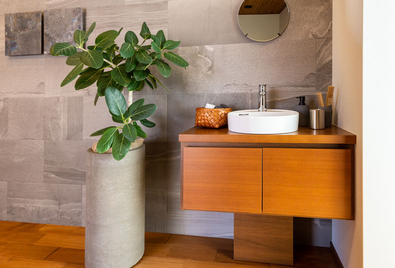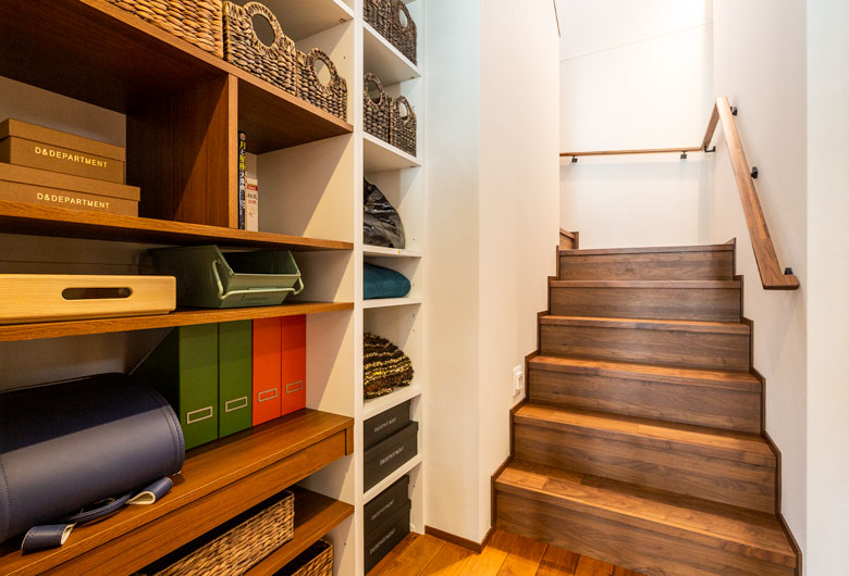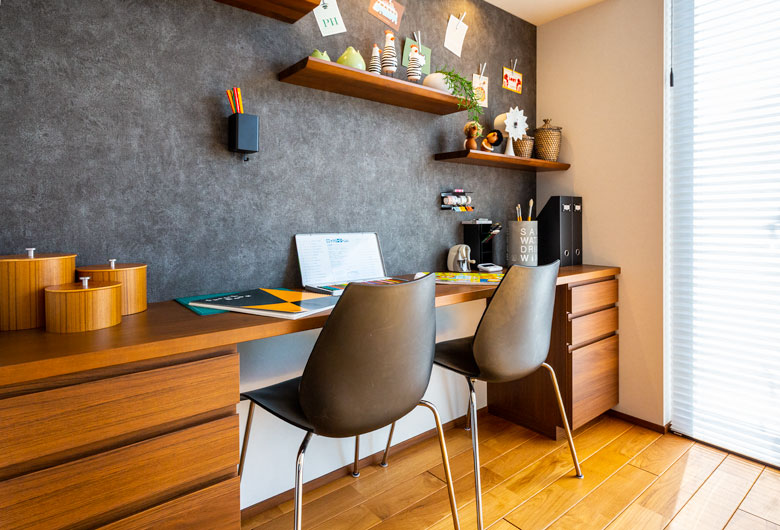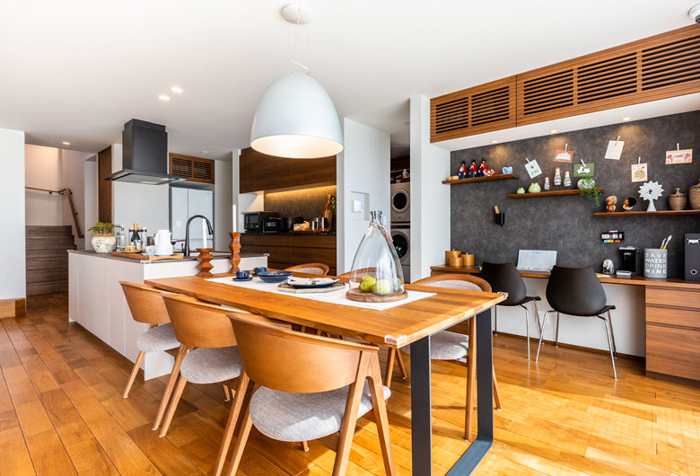 当モデルハウスは共働きの4人家族で、仕事も家事も両方楽しむ暮らしをイメージしております。お子様が学校から帰ってきて、手を洗いランドセルをしまうまでの動きを考慮した「こども動線」と普段忙しい夫婦の為の洗濯をし、干してから収納するまでを考えた「洗濯動線」が特徴です。リビング上部の吹き抜けやビッグフレーム構法ならではの大開口による解放感と木の専門商社ならではの上質な木質感で、住友林業らしい木に住まいが体感いただけます。