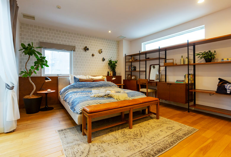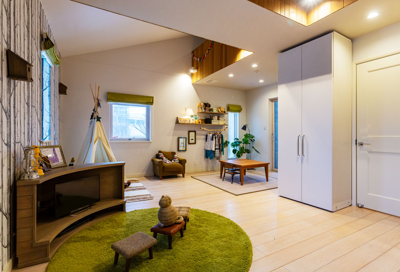 木々のぬくもりを感じながら、自分らしい場所と家族がつながりあえる場所を両立させたモデルハウス。気が付いたら、自然と会話が弾むような空間を作りました。子供部屋には隠れ家のようなロフト、中庭の雰囲気のあるセミクローズなウッドデッキがあり、毎日家に帰るとき、一番のお気に入りの場所に行くような気持ちを感じてほしいという思いが詰まっています。